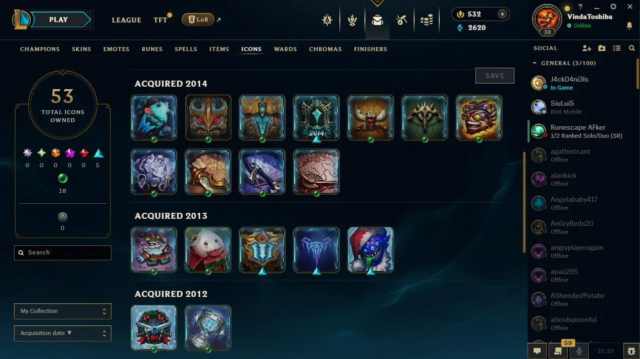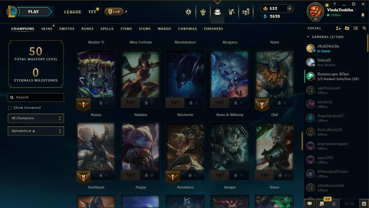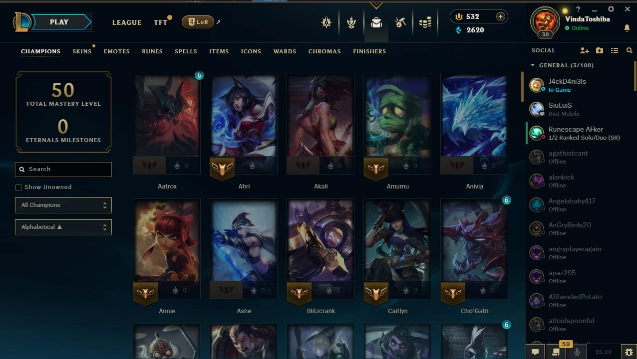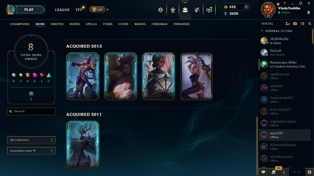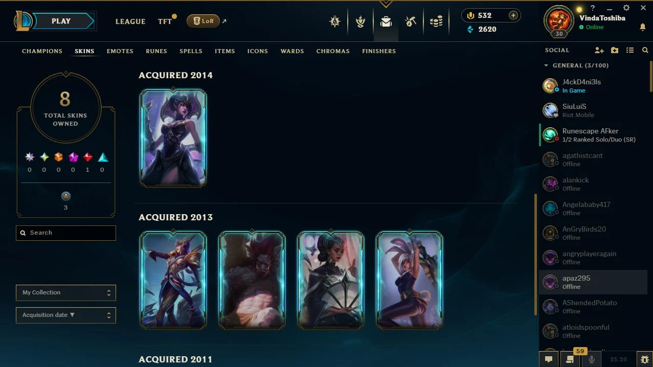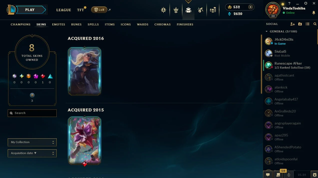 [NA] ⸱ LEVEL 30 ⸱ UNRANKED ⸱ 8 SKINS [ 2620 BE , 532 RP ] ⸱ 79 CHAMP