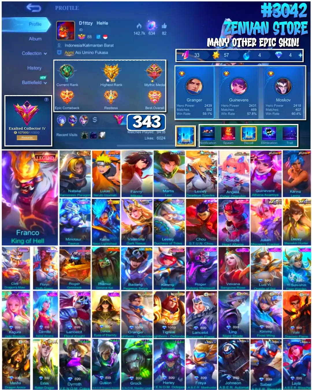 #3042 🔥 343 Skins 🔥 Legend Franco 🔥 Collector Natalia 🔥 Naruto 🔥 Attack on Titan Mikasa, Levi 🔥 Aspirant Lesley, Angela 🔥 Stun Chou 🔥 Transformers Roger 🔥 KoF Guinevere, Karina 🔥 Many Limited 🔥 Many Epic 🔥 Safe Account ✅