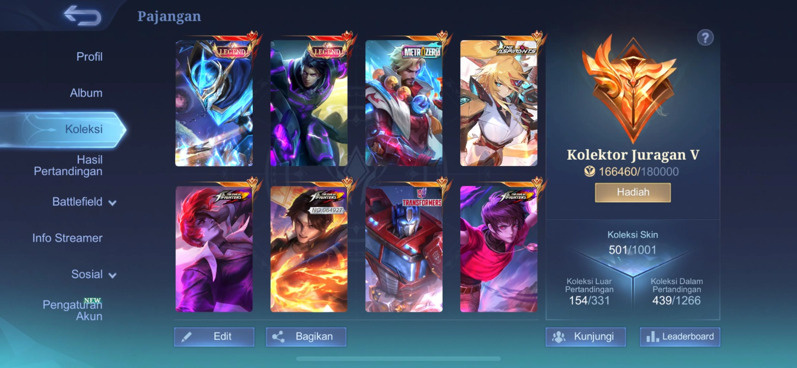 Best Deal Mega Colector V🔥501 Skinss🔥Alucard X Gusion Legend🔥Roger MetroZero🔥4 KOF🔥Aspirant Lesley🔥Transformer Jhonson x Roger🔥Acces Full🔥Cheapest and Safe Account