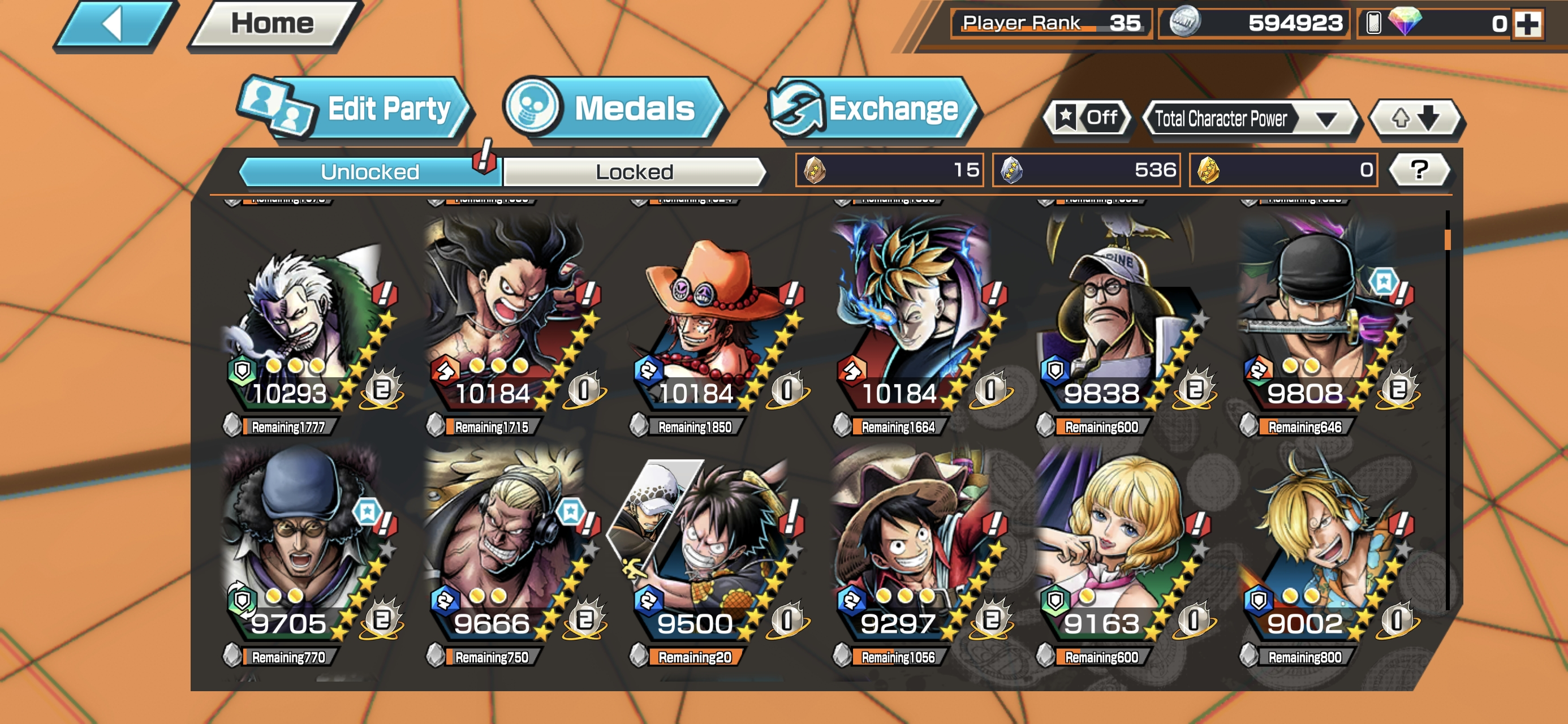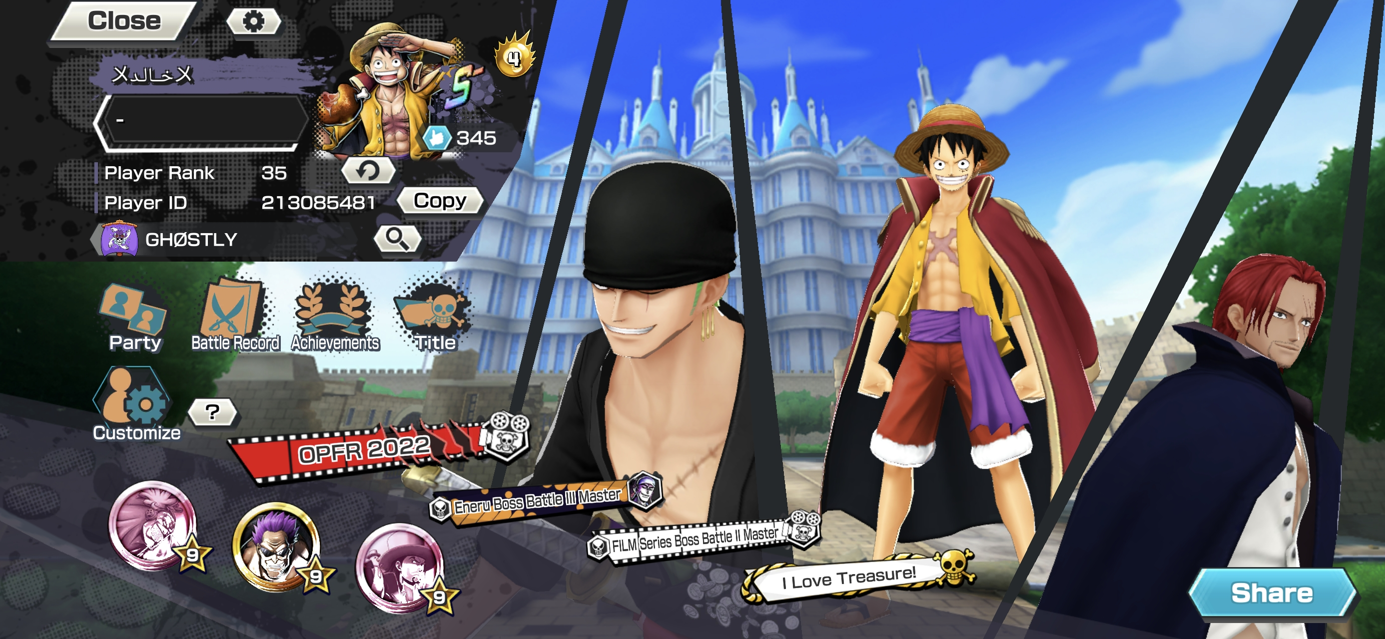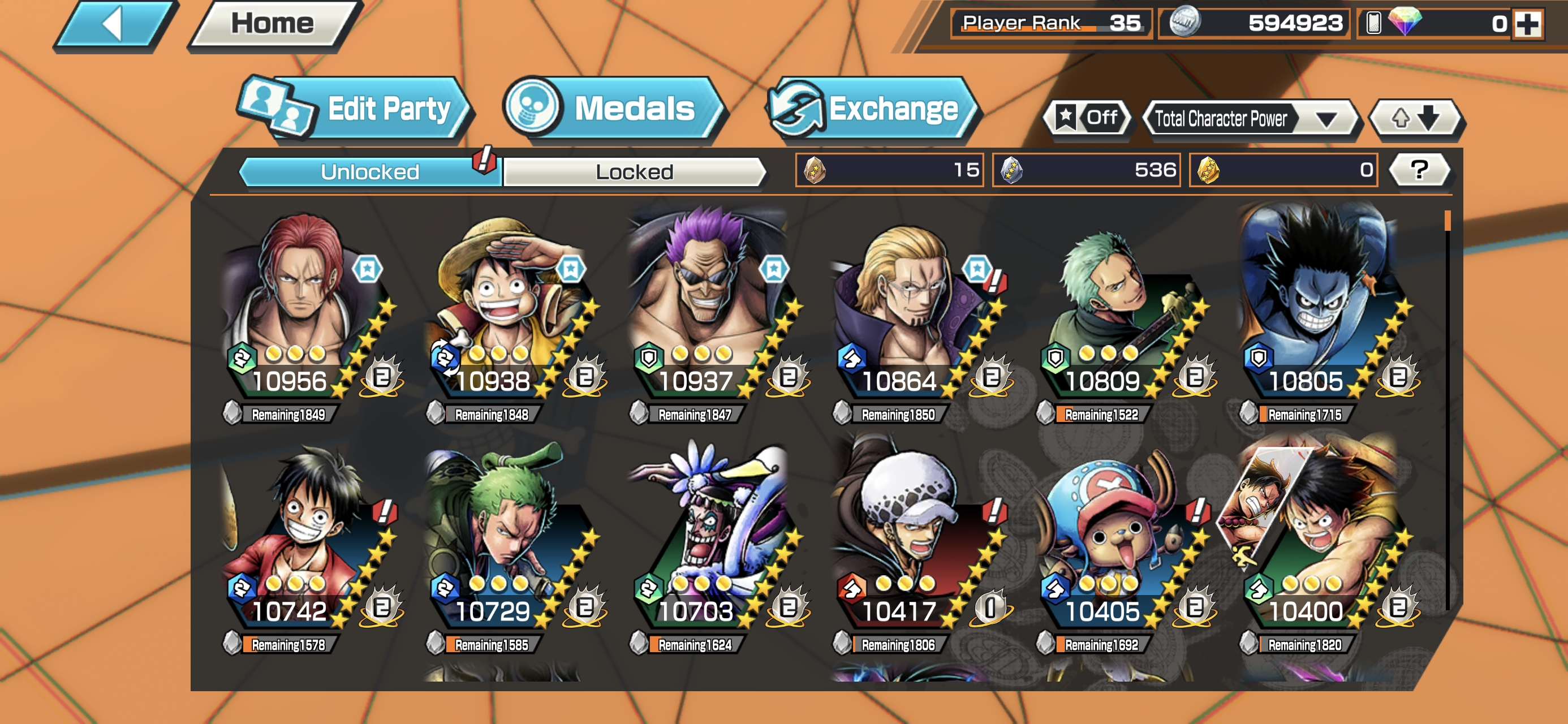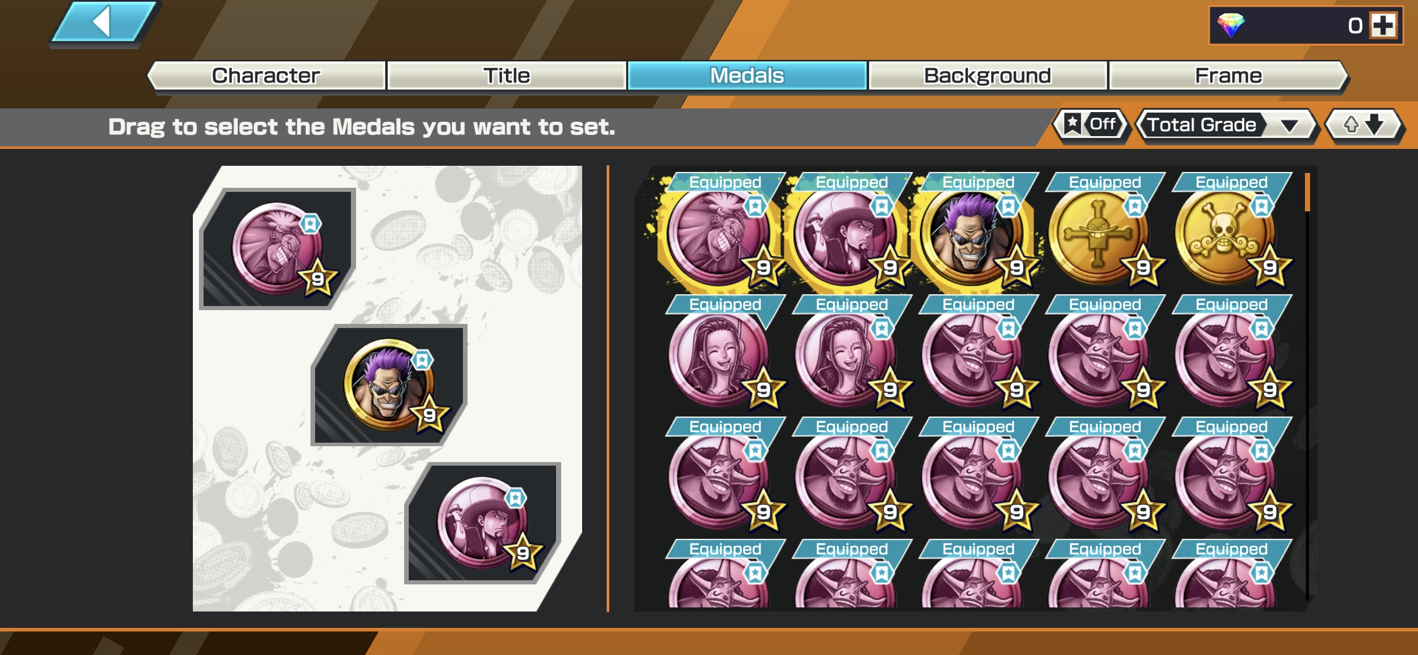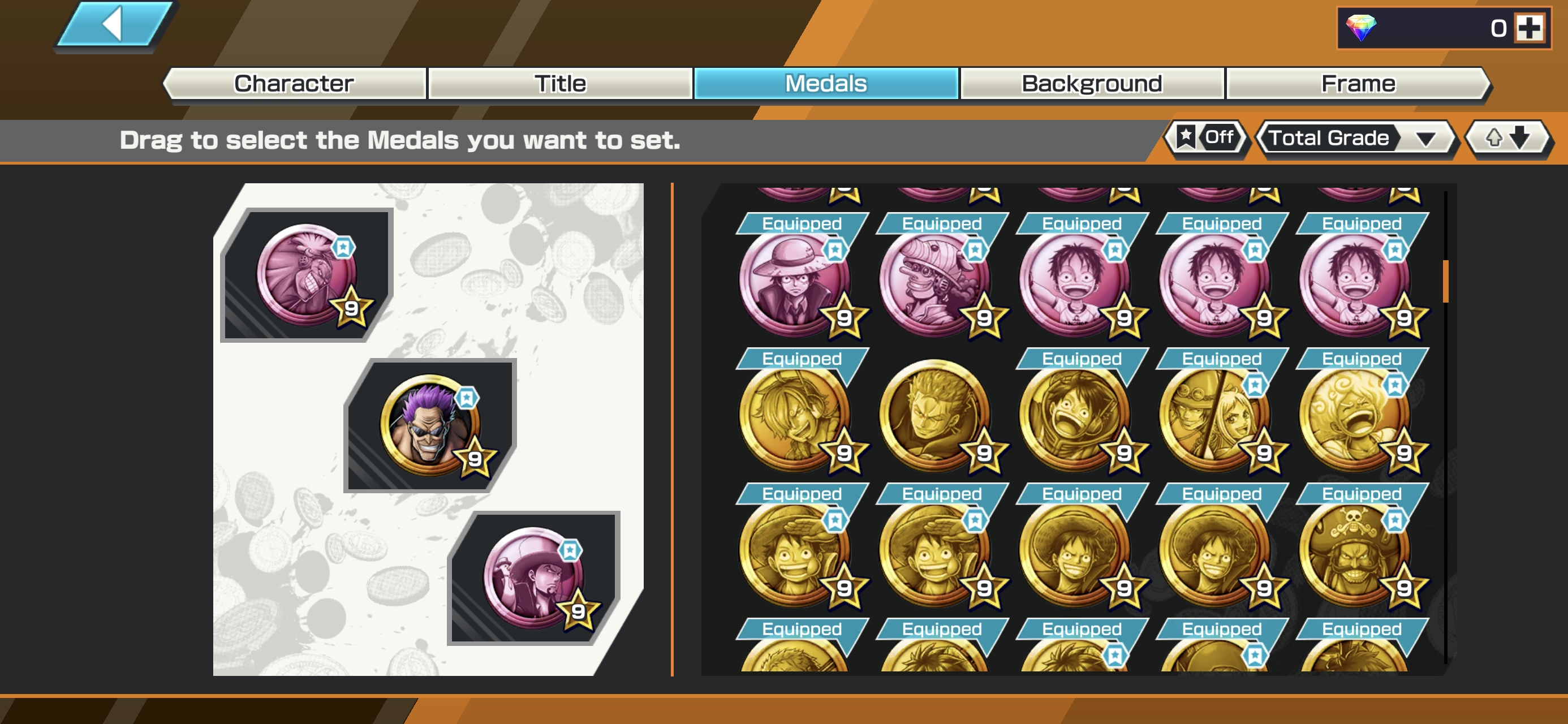 6 Ex Meta 3 Max ⸱ Shanks Max ⸱ Luffy Max ⸱ Zephyr Max ⸱ Oni Zoro ⸱ Kuzan ⸱ Marshall ⸱ Support 146 ⸱ Good Medal ⸱ Gems ⸱ Many Medal Material ⸱ B489