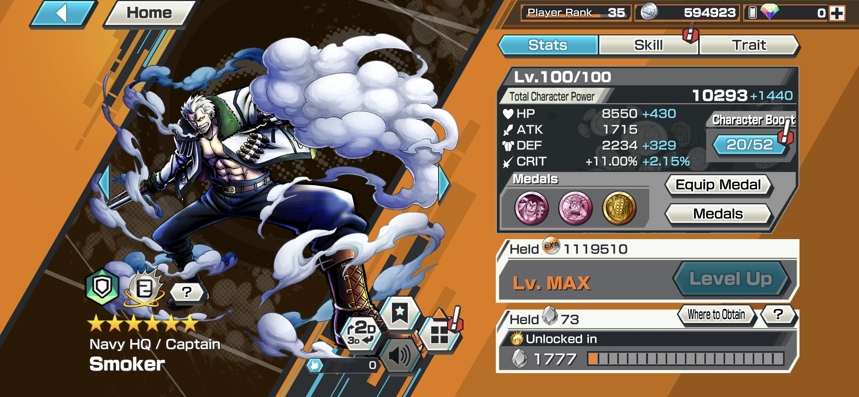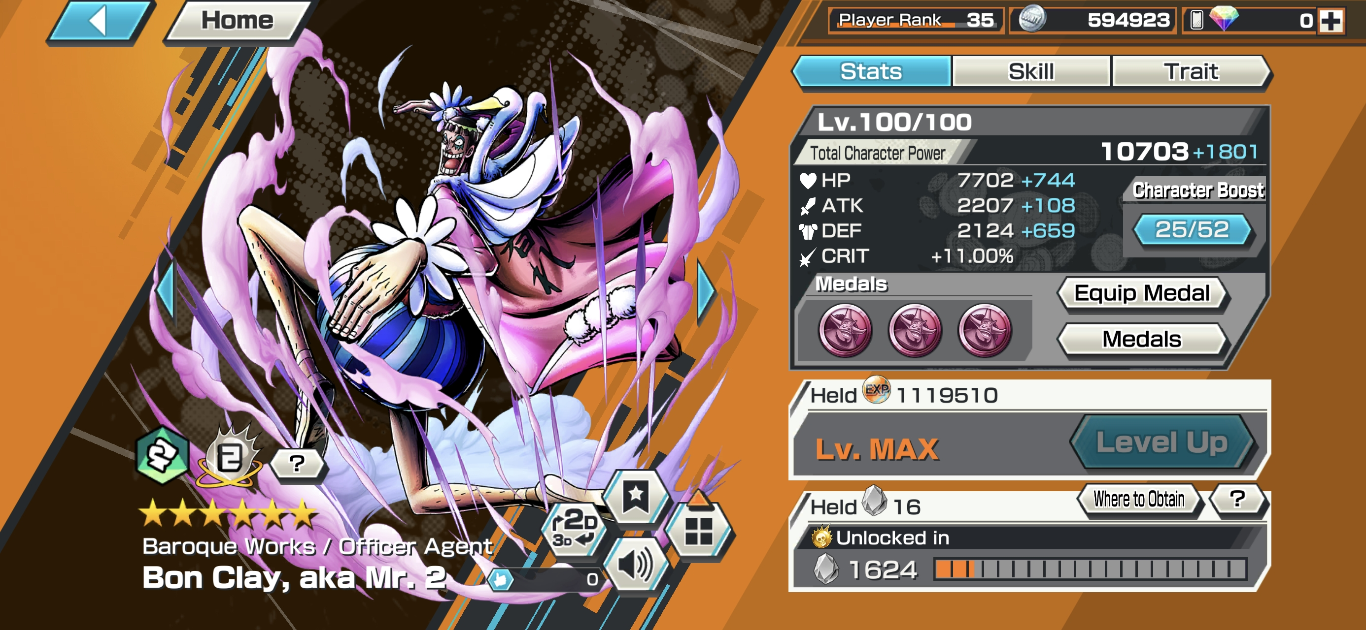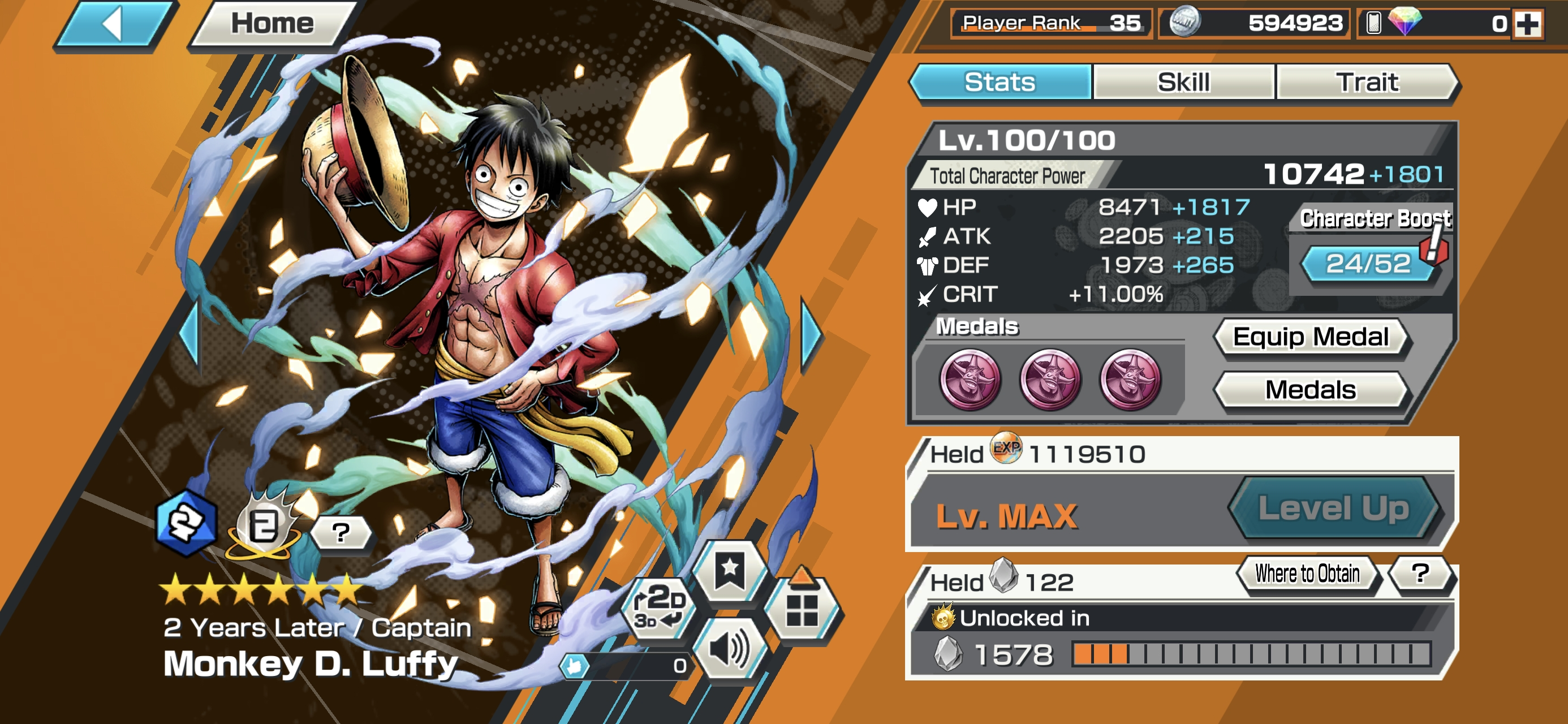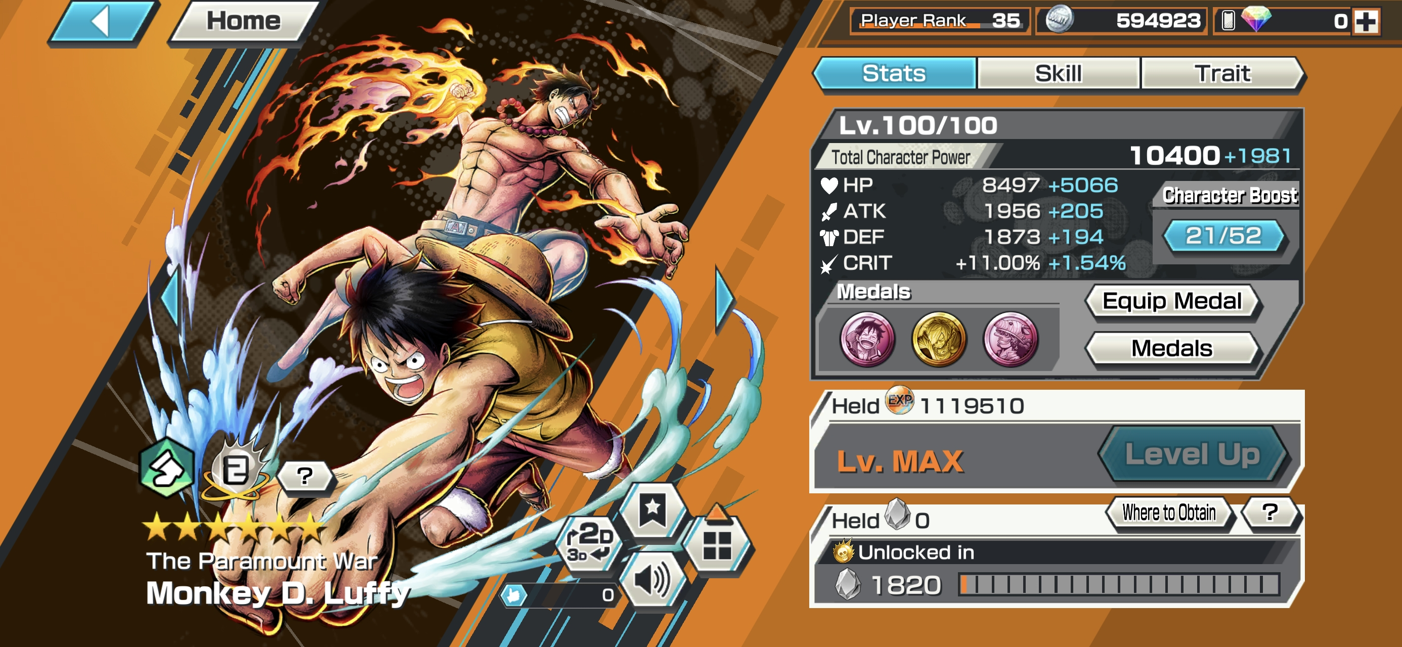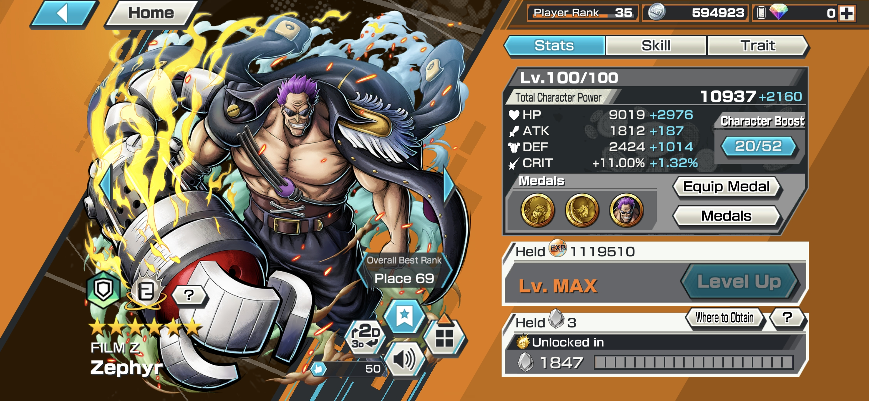 6 Ex Meta 3 Max ⸱ Shanks Max ⸱ Luffy Max ⸱ Zephyr Max ⸱ Oni Zoro ⸱ Kuzan ⸱ Marshall ⸱ Support 146 ⸱ Good Medal ⸱ Gems ⸱ Many Medal Material ⸱ B489