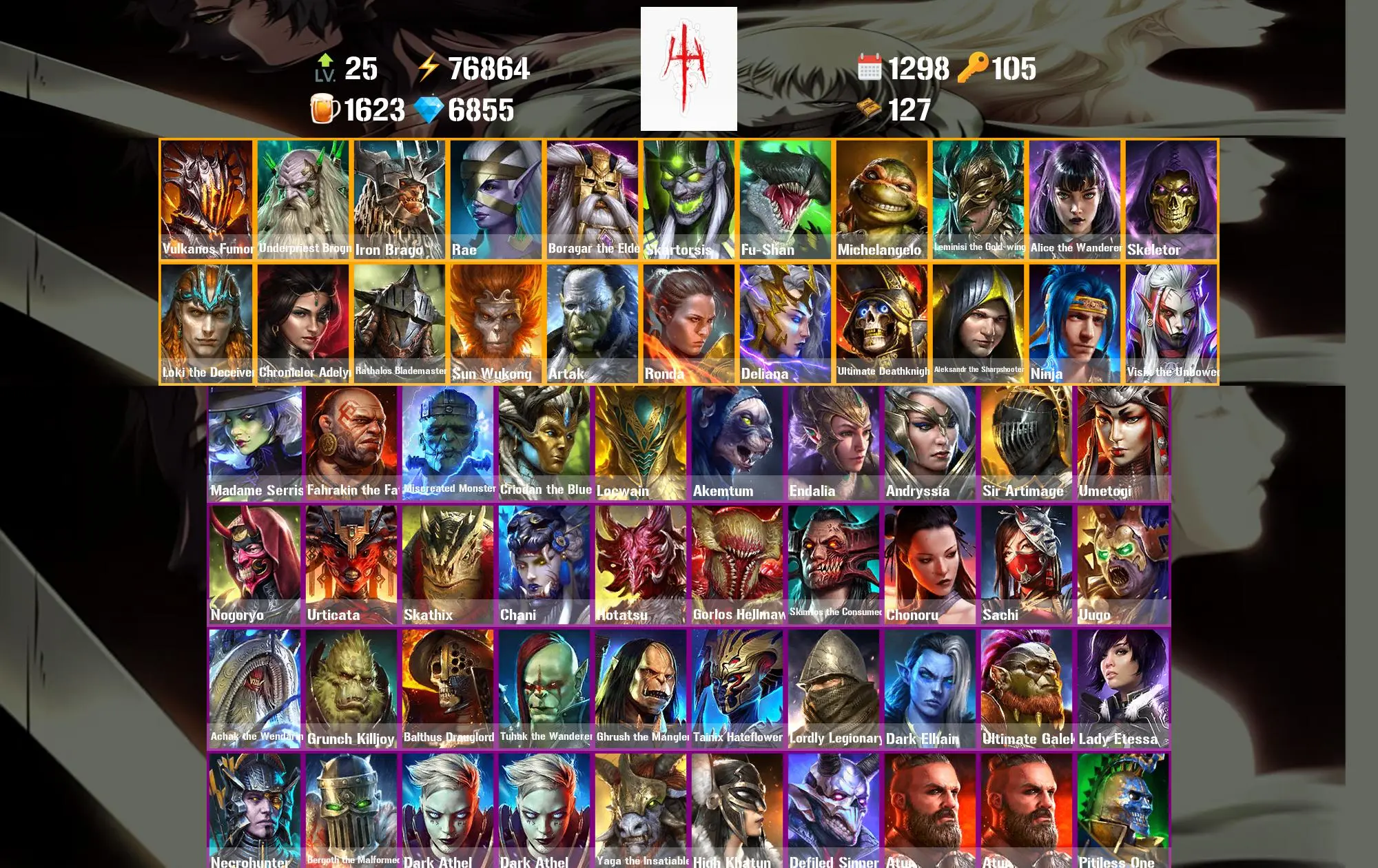 1298 Days 76.9k Energy Vulkanos Fumor ⸱ Underpriest Brogni ⸱ Iron Brago ⸱ Rae ⸱ Boragar the Elder ⸱ Madame Serris ⸱ Fahrakin the Fat ⸱ 45.6m Silver ⸱ 6.9k Gems