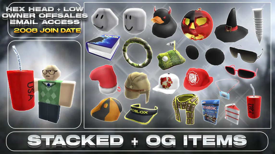 ROBLOX 2008 Account 🔥 64+ Offsales & Limiteds 🔥 Hex Head + Classic ROBLOX Pumpkin + Wanwood Ring of Olympia + Roll Head + Circle Ears + Ice Cold Stunnas + Evil Duck + Red Sunglasses + Tix Scarf + Witch Hat + Cake Hat | 4K+ Robux SPENT | Email Access ✅