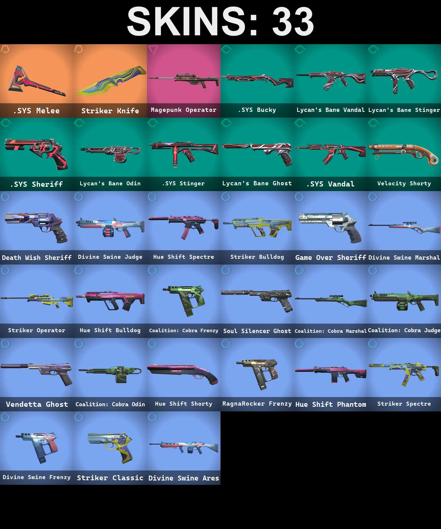 33 SKINS | 2 KNIFE | MAGEPUNK OPERATOR | DIVINE SWINE MARSHAL | DIVINE SWINE JUDGE | DIVINE SWINE ARES | DIVINE SWINE FRENZY | .SYS MELEE | STRIKER KNIFE | .SYS BUCKY | LYCAN'S BANE VANDAL | LYCAN'S BANE STINGER | .SYS SHERIFF | L