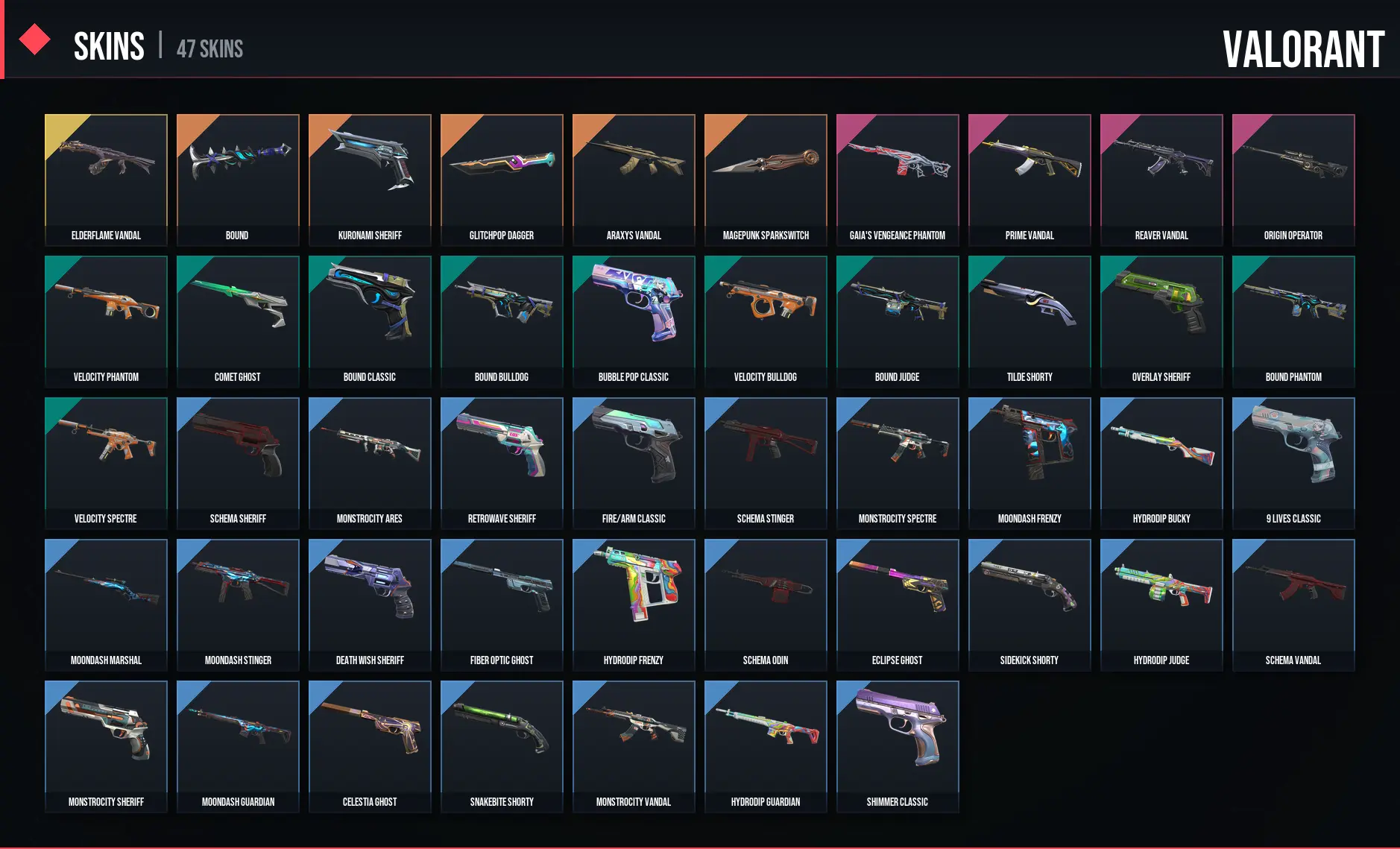 47 Skins / 22825 VP SPENT / Glitchpop Dagger / Elderflame Vandal / Kuronami Sheriff / Prime Vandal / Reaver Vandal / Araxys Vandal / Magepunk Sparkswitch / Origin Operator