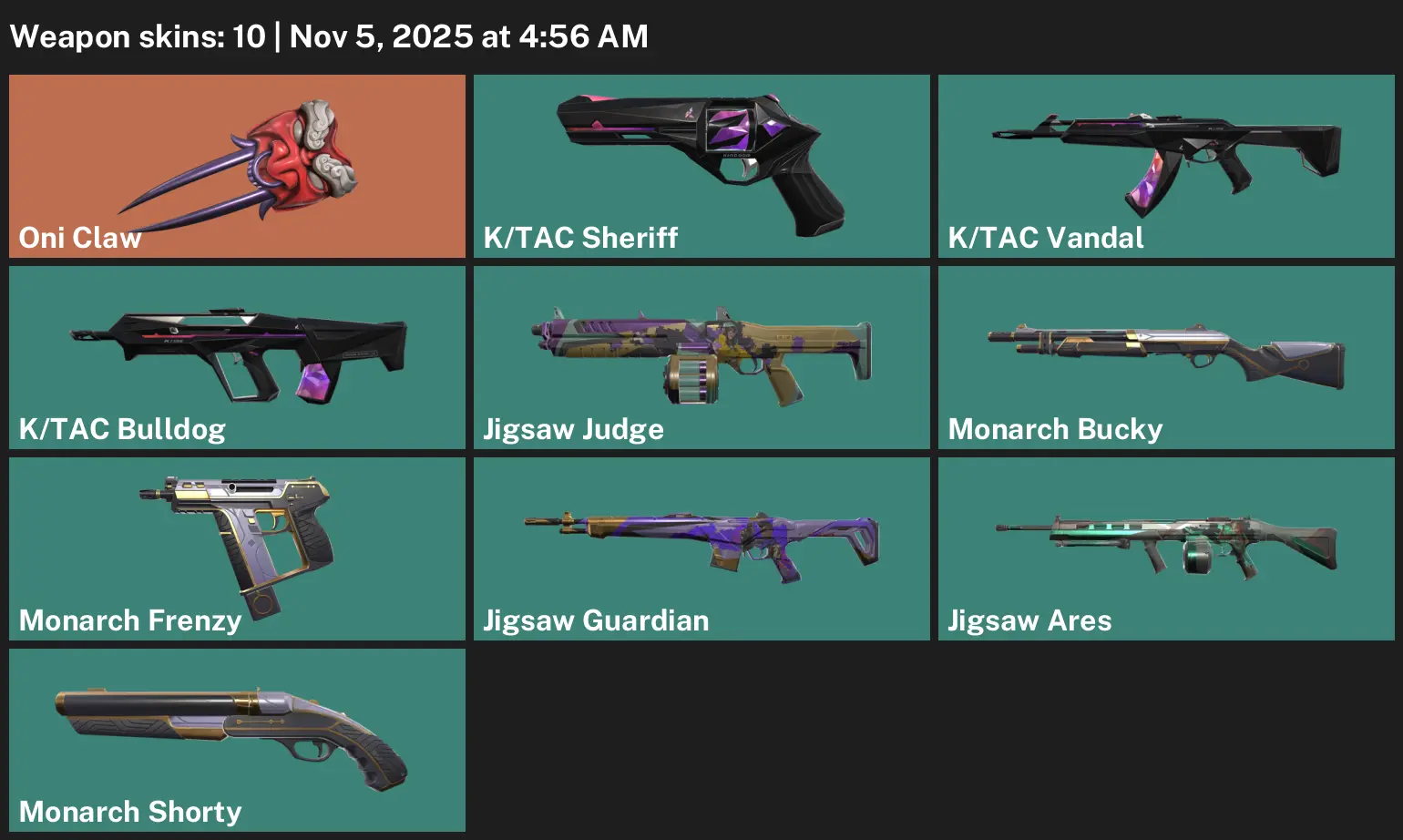 AP | 10 Skins | exp GOLD 1 | Oni Claw | K/TAC Vandal | Monarch Frenzy | K/TAC Sheriff | K/TAC Bulldog | Jigsaw Judge | Monarch Bucky | S4G