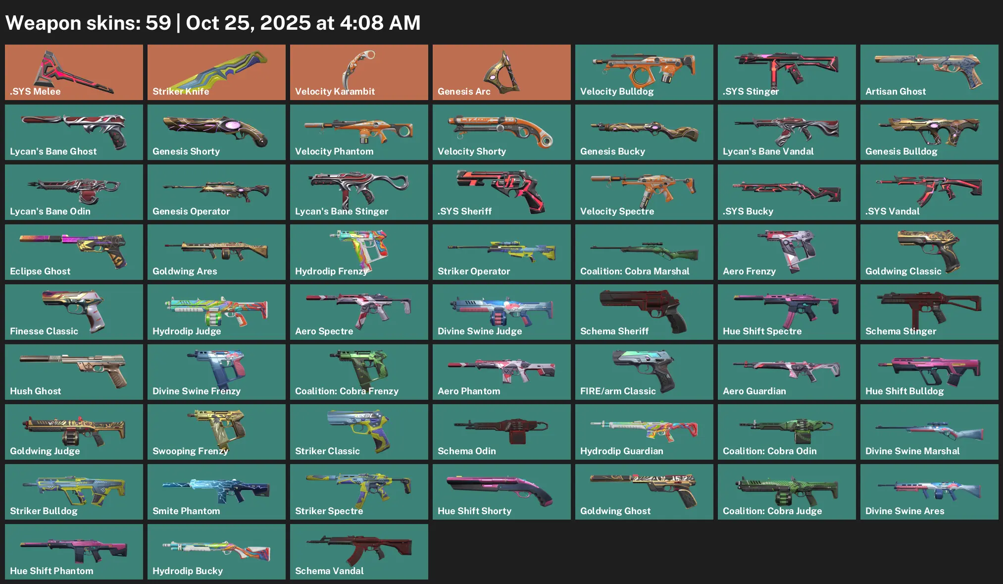 AP | 59 Skins | exp SILVER 2 | Genesis Arc | .SYS Melee | .SYS Vandal | Schema Vandal | Lycan's Bane Vandal | Aero Phantom | Velocity Phantom | S4G
