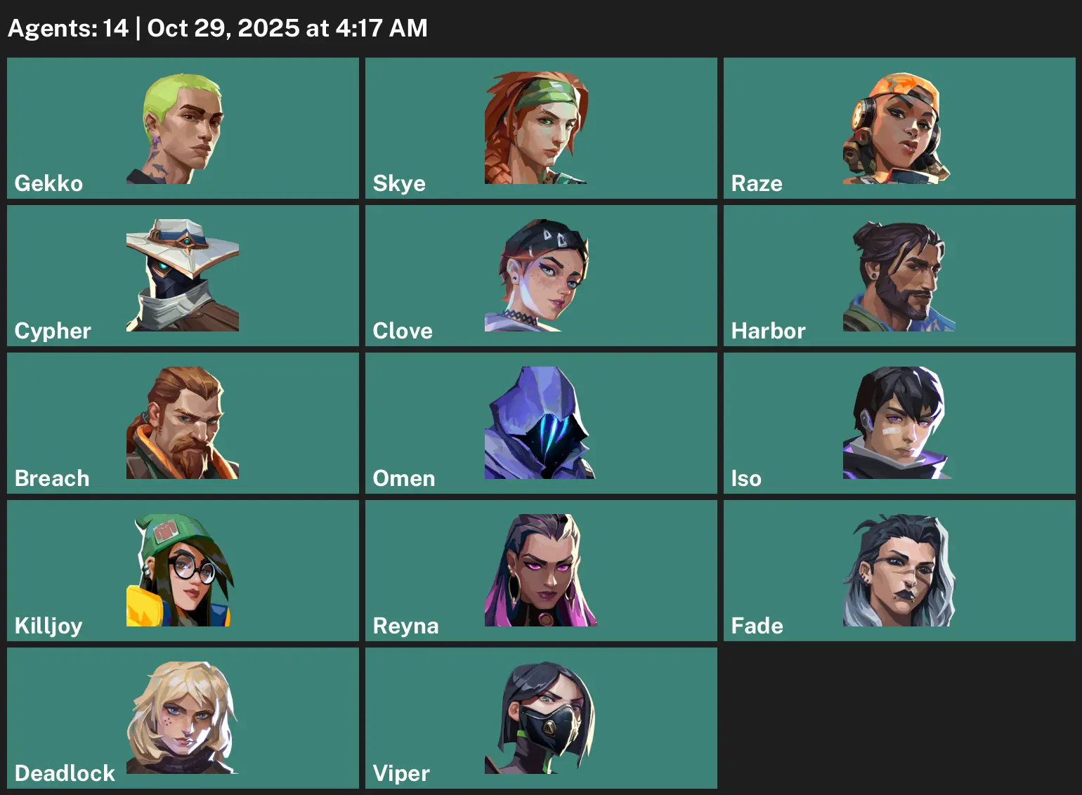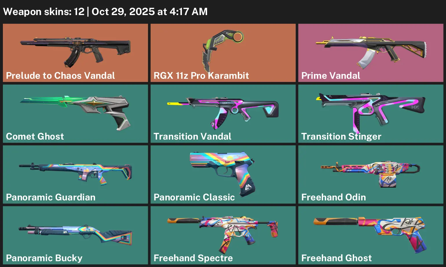 🛀 AP 🏹 Unranked 🍐 12 Skins 🕶 256 VP 💦 14 Agents 🗞 Value: 8300 VP 🦙 Prelude to Chaos Vandal 🎒 RGX 11z Pro Karambit 🍇 Prime Vandal 🐏 Comet Ghost 😝 Transition Vandal 🚡 Transition Stinger
