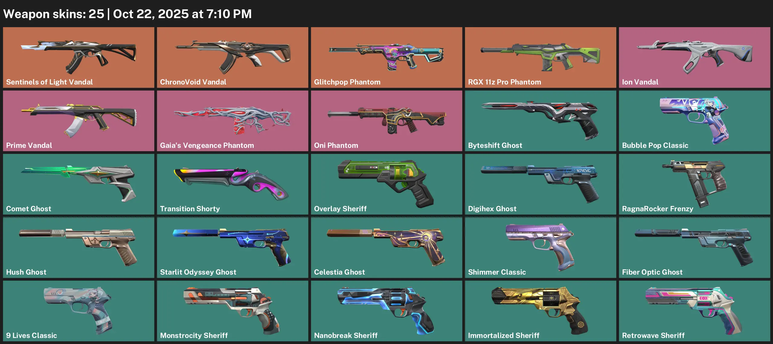 🥋 AP 🚨 Unranked 👁 25 Skins 🔫 452 VP 😝 22 Agents 😪 Value: 15800 VP 🐃 Sentinels of Light Vandal ☀️ ChronoVoid Vandal 🌉 Glitchpop Phantom 🍋🟩 RGX 11z Pro Phantom ⛷ Ion Vandal 🛎 Prime Vandal
