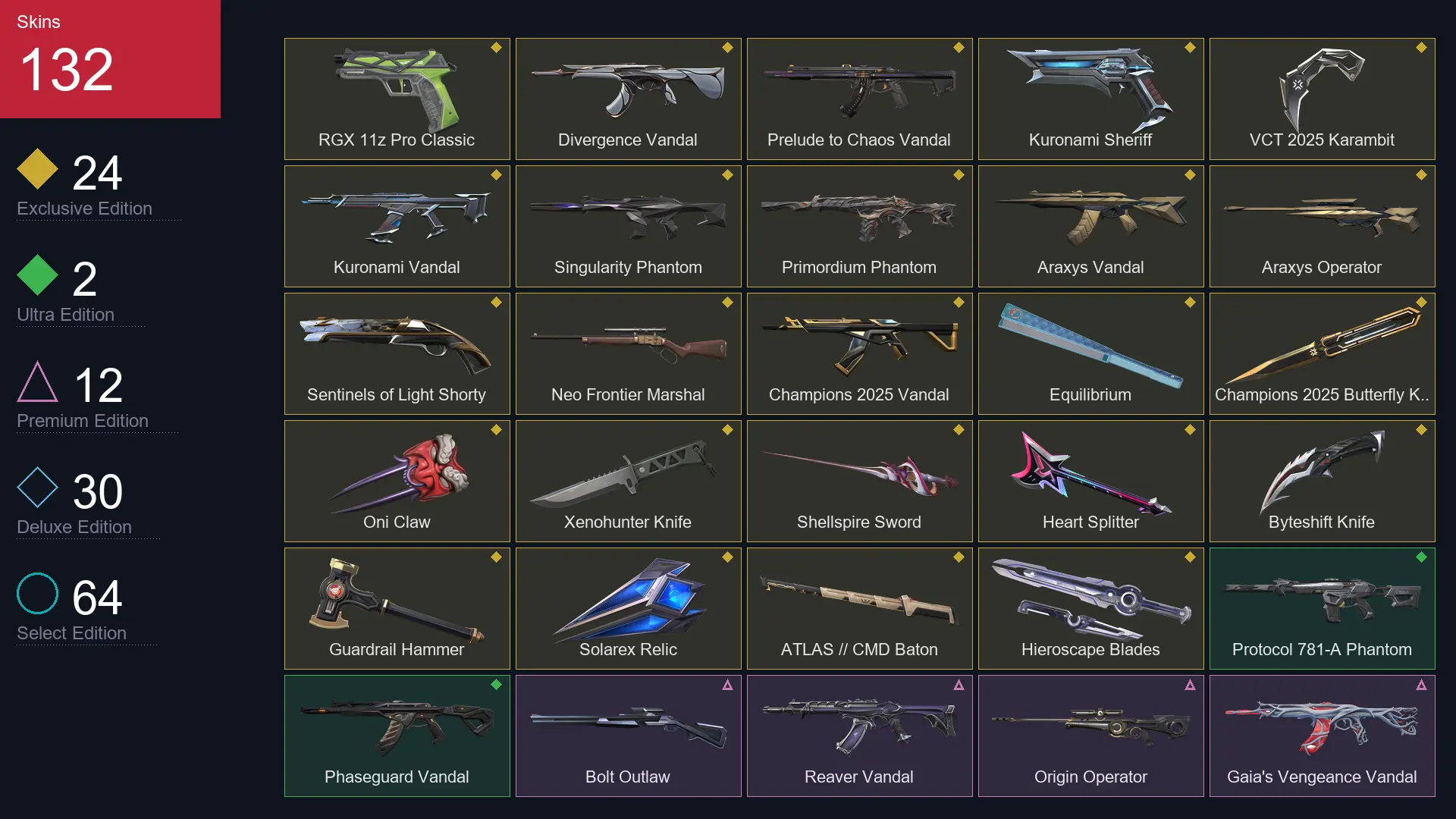 🐸 EU 🥀 132 Skins 🥝 24 Agents 🐢 Level 🍀 ☄️ RGX 11z Pro Classic 🍩 Protocol 781-A Phantom 🐉 Bolt Outlaw 🐲 Divergence Vandal 🥝 Reaver Vandal +127 more