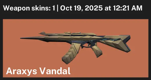 🛬 EU 🧦 Unranked 🦷 1 Skins 🪵 75 VP 💀 1 Agents ⛑ Value: 2175 VP 🩻 Araxys Vandal