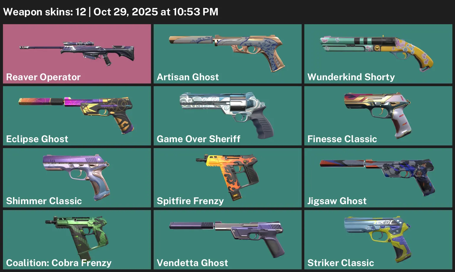 🌪 EU 🧄 Unranked 🗽 12 Skins 😜 46 VP 🌏 18 Agents 🎳 Value: 1775 VP 🍑 Reaver Operator 🏤 Artisan Ghost 🥜 Wunderkind Shorty 🤓 Eclipse Ghost 🏌️ Game Over Sheriff 👅 Finesse Classic