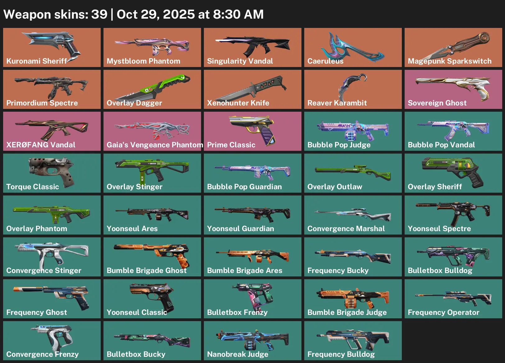 🛝 EU 🦂 Unranked 🥄 39 Skins 🐕🦺 341 VP 🏺 8 Agents 🔫 Value: 30800 VP 🥲 Kuronami Sheriff 👚 Mystbloom Phantom 🌩 Singularity Vandal 🏫 Caeruleus 🚑 Magepunk Sparkswitch 🎳 Primordium Spectre
