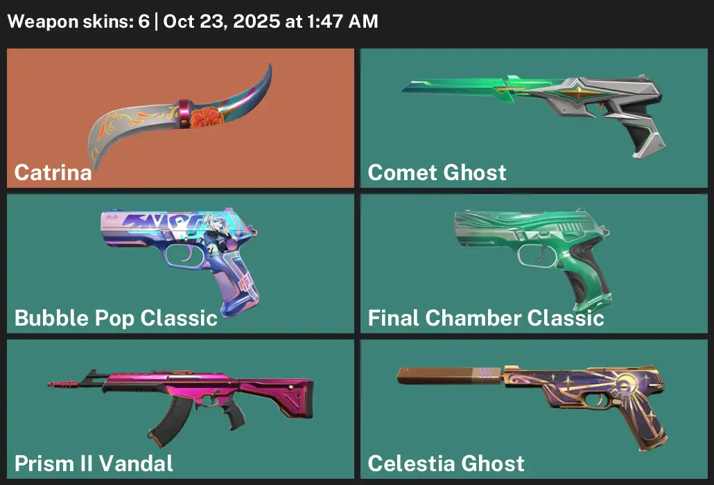 🐖 EU 🧬 Unranked 📱 6 Skins 💐 81 VP 🌑 19 Agents 😝 Value: 3425 VP 🚟 Catrina 🏋️ Comet Ghost 📖 Bubble Pop Classic 💒 Final Chamber Classic 🥅 Prism II Vandal 🚢 Celestia Ghost