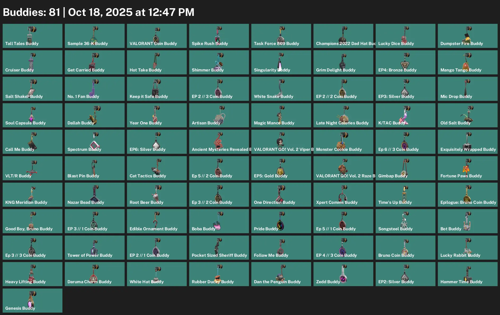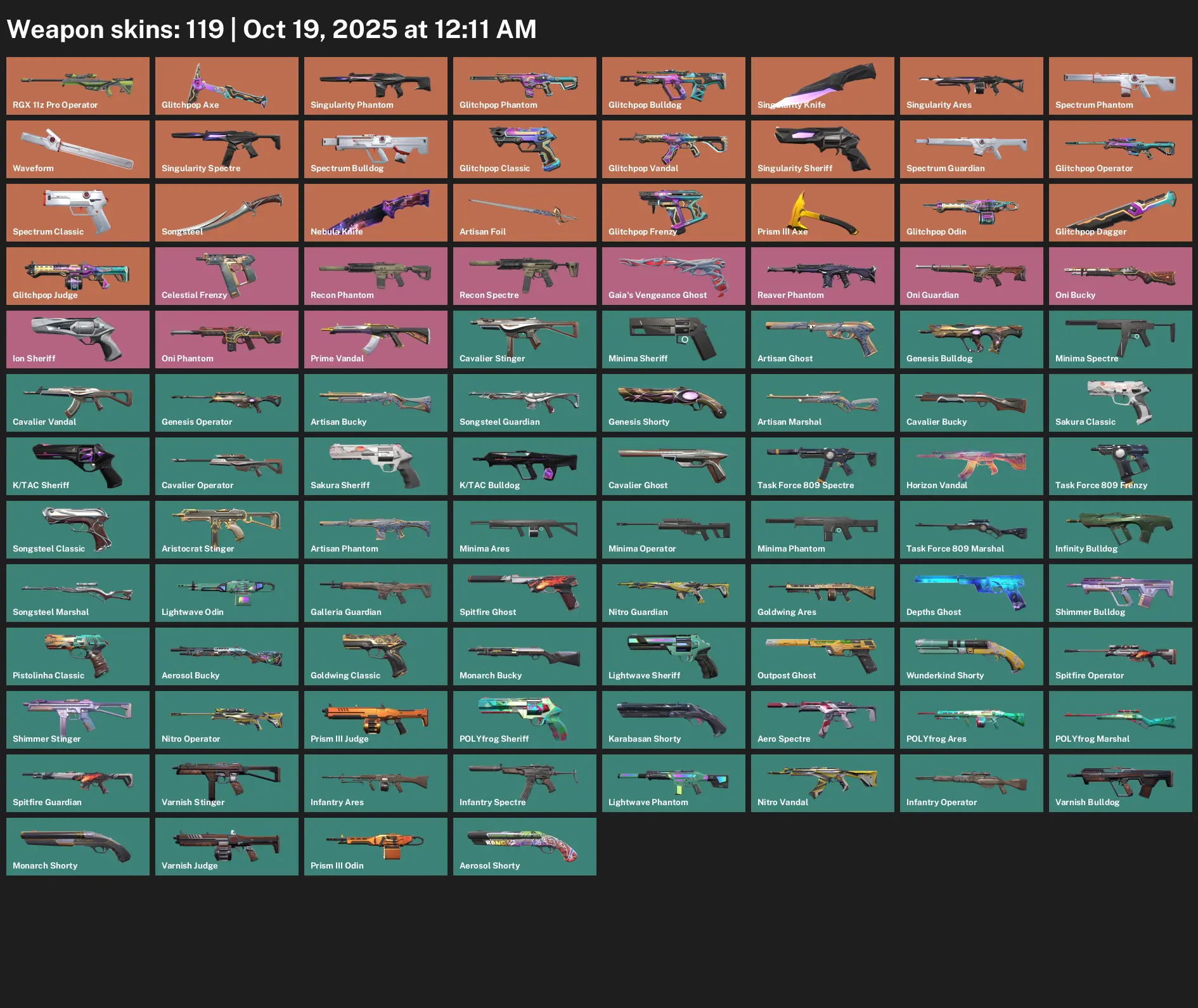🐌 NA ☹️ Unranked 🌞 119 Skins 🍰 377 VP 🚖 23 Agents 👚 Value: 96275 VP 🦔 RGX 11z Pro Operator 💩 Glitchpop Axe 🛬 Singularity Phantom 🦟 Glitchpop Phantom 🎩 Glitchpop Bulldog 🪳 Singularity Knife