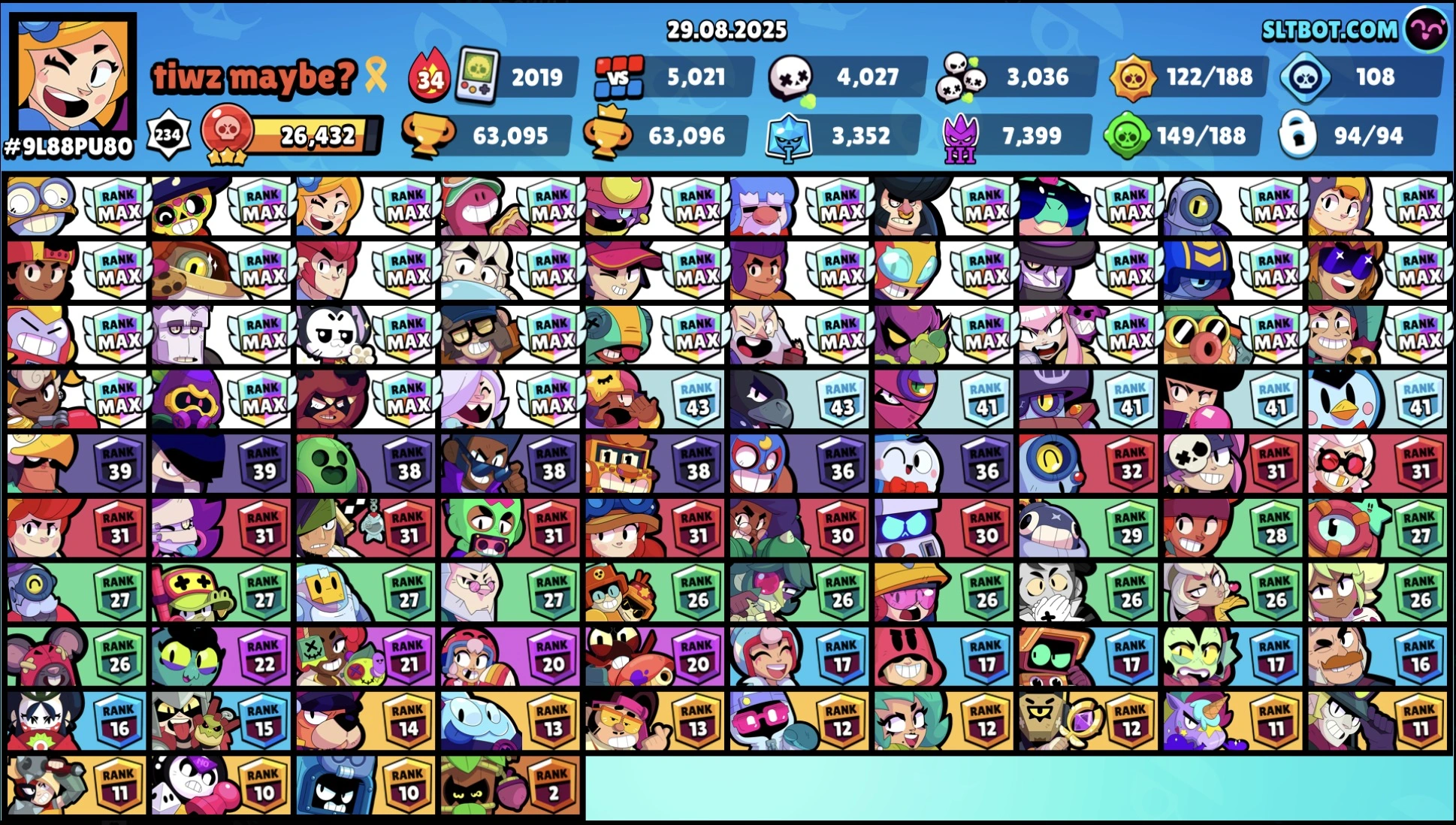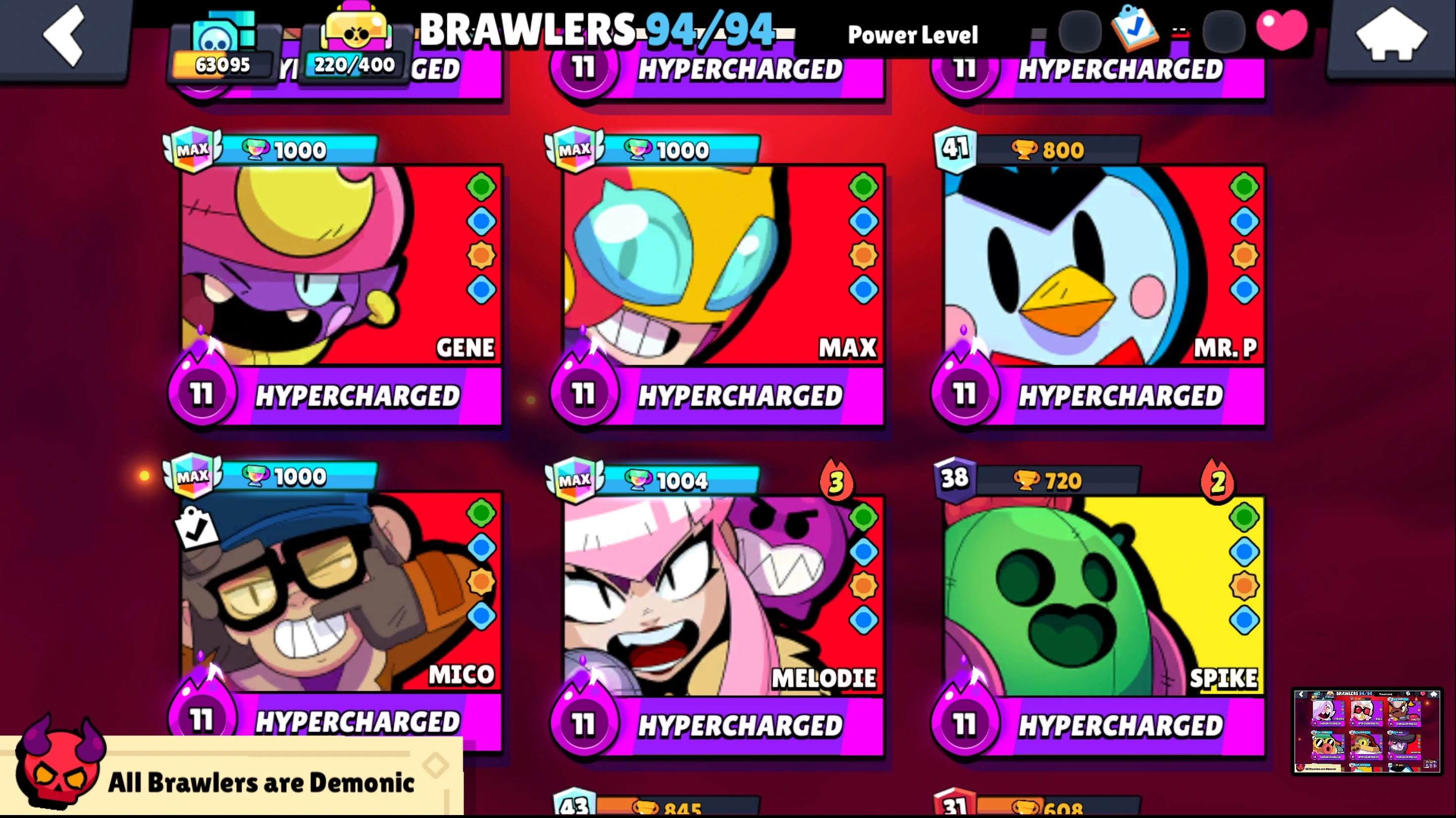 11.11 PIN ⭐ 259 SKINS ⭐ 63.100 TROPHY ⭐ 94 BRAWLERS ⭐ 31 MAX ⭐ 21 HYPERCHARGED ⭐ CHAINSAW BUSTER ⭐ MECHA MORTIS ⭐ CAPTAIN CARL ⭐ DIY SURGE ⭐ KABOCHA FANG ⭐ SPIKE ⭐ LEGENDARY ⭐ LEON