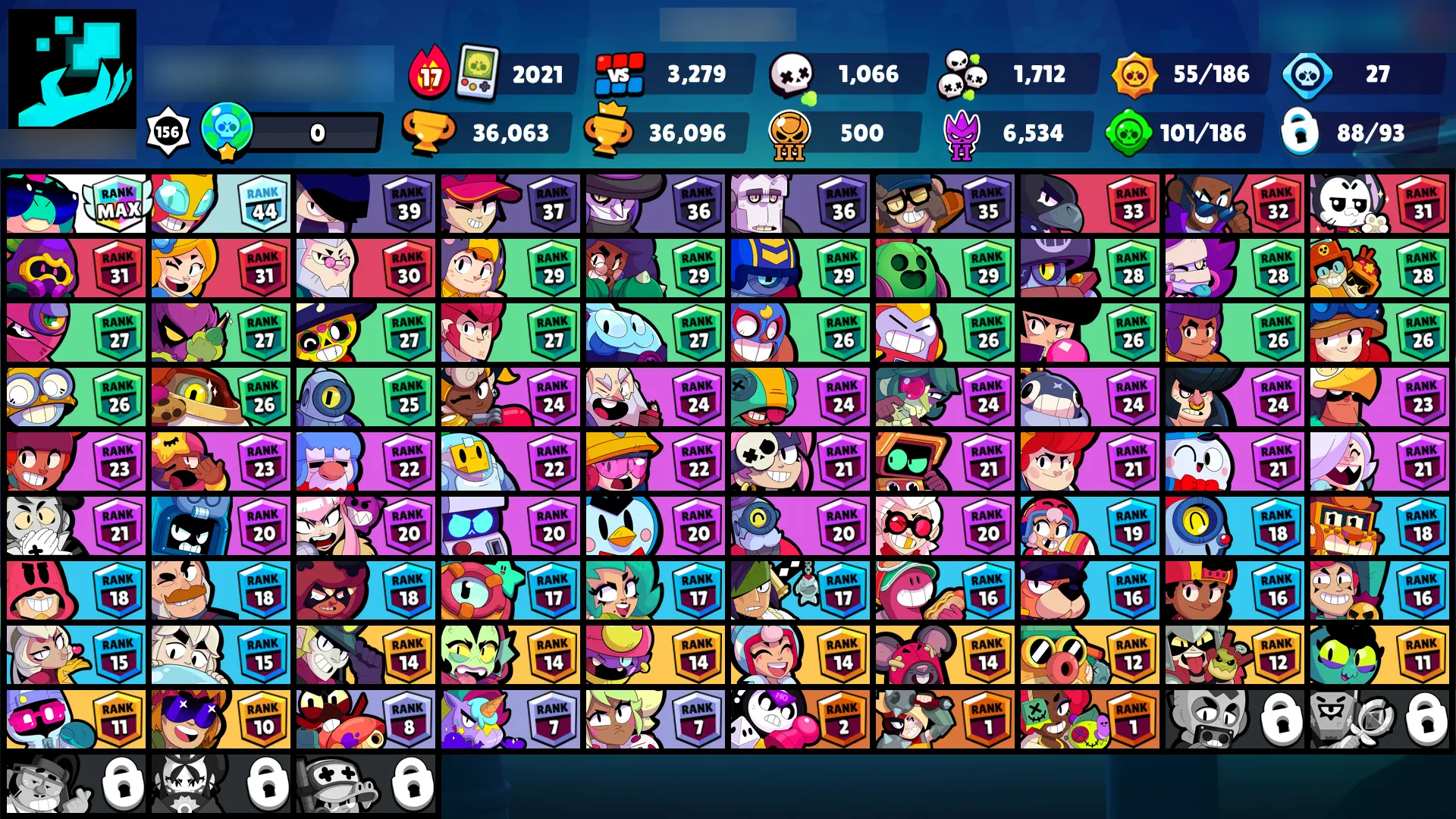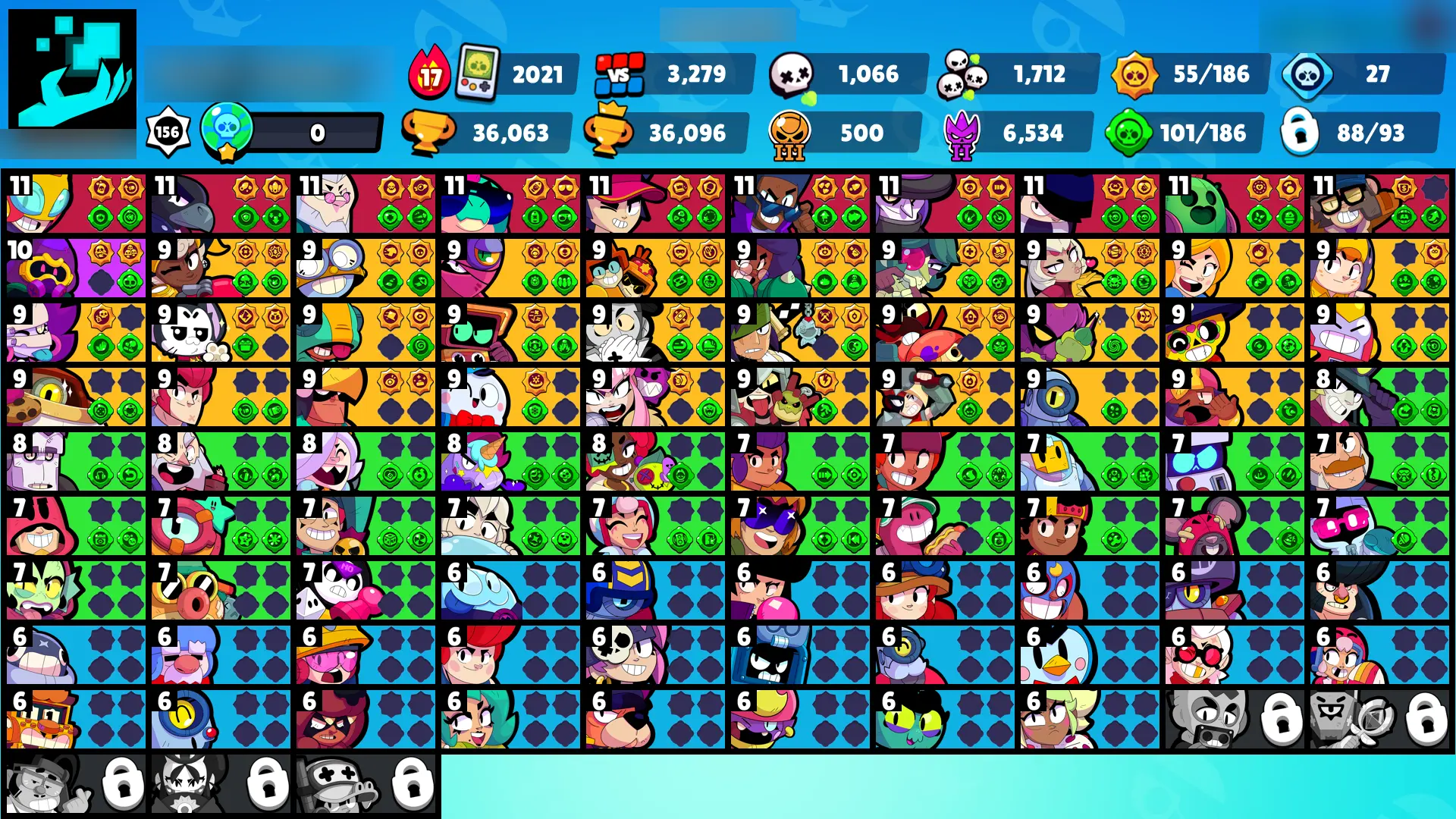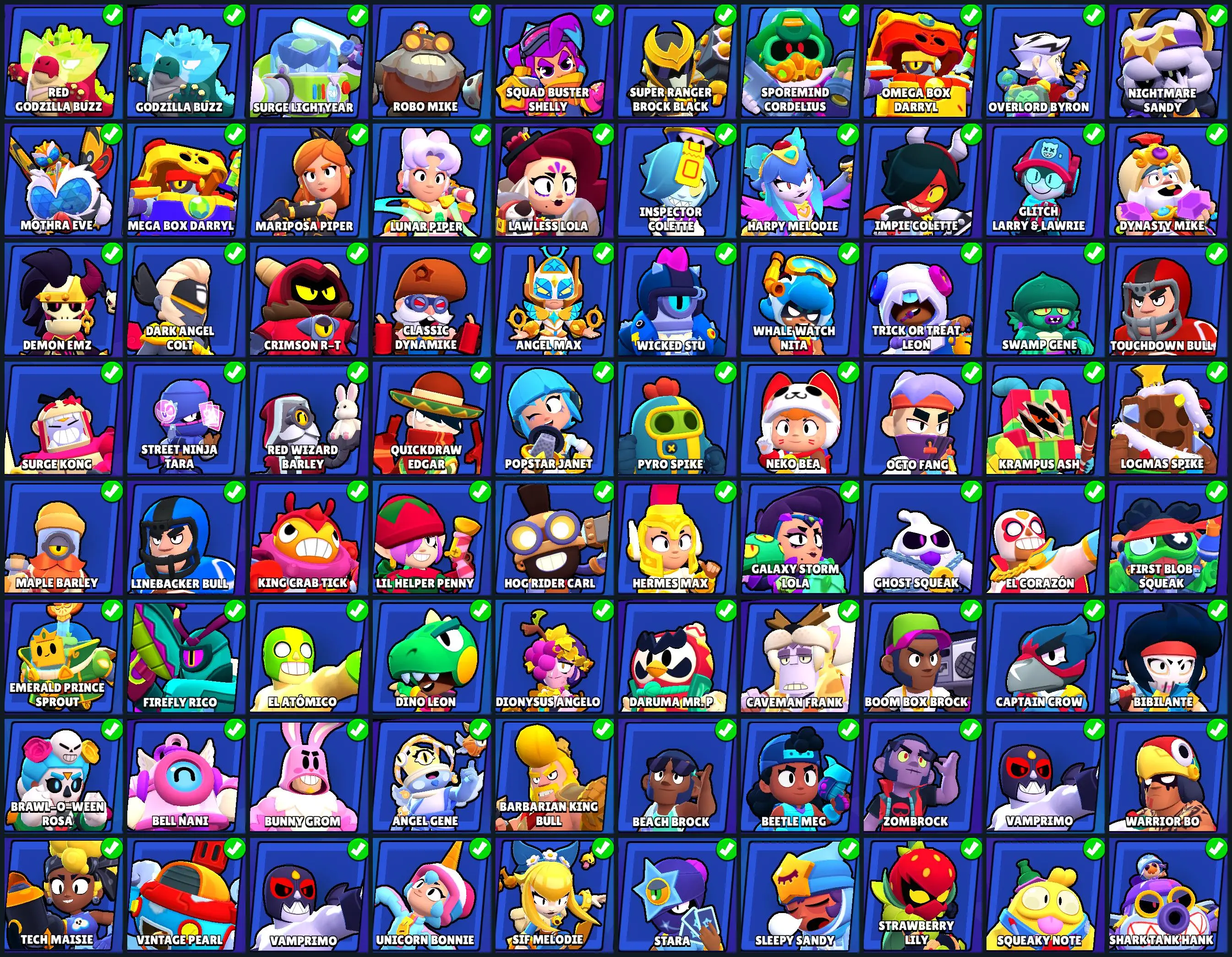124 SKINS | 36063 TROPHIES | BRAWL-O-WEEN ROSA | LAWLESS LOLA | HERMES MAX | GODZILLA BUZZ | RED GODZILLA BUZZ | SURGE LIGHTYEAR | SUPER RANGER BROCK BLACK | ROBO MIKE | WARRIOR BO | MARIPOSA PIPER | LUNAR PIPER | IMPIE COLETTE | 88 BRAWLERS