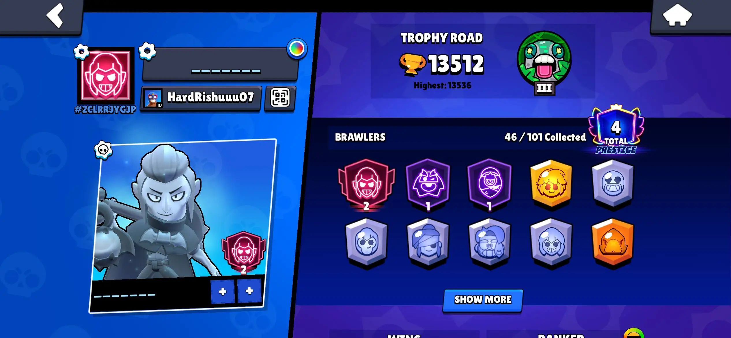 13.5k Trophies 🏆 | 46 Brawlers ✅ 4 Hypercharged ⸱ Dynamike , Stu , Mortis , Tara ✅ 3 Max ⸱ Colt , Rico , Crow 💥 69 Skins 🎨 Instant Delivery 🚀 #B749