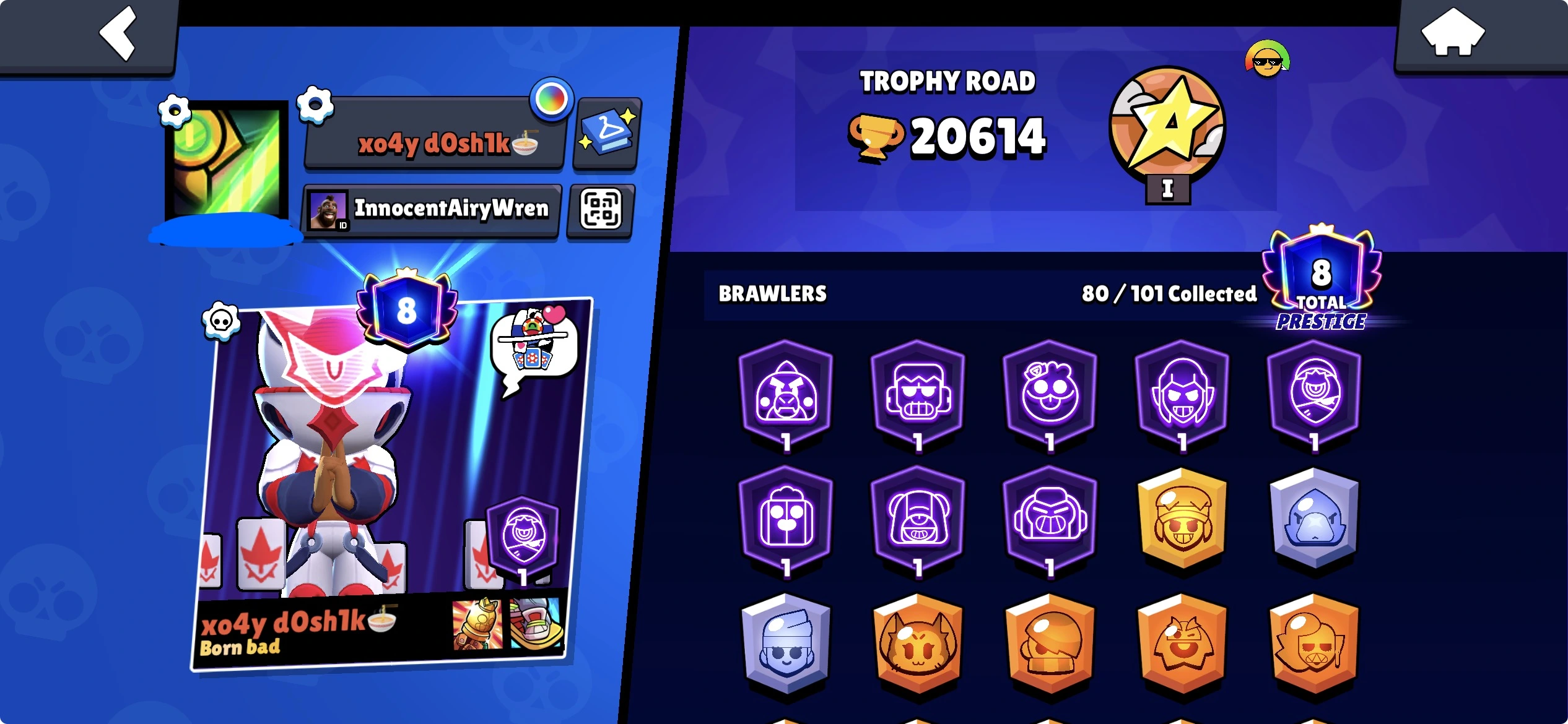 💜147 SKINS💜20.614 TROPHIES💜80 BRAWLERS 💜22 HYPERCHARGED💜8 PRESTIGE💜13 BUFFIES💜11 MAXED BRAWLERS💜