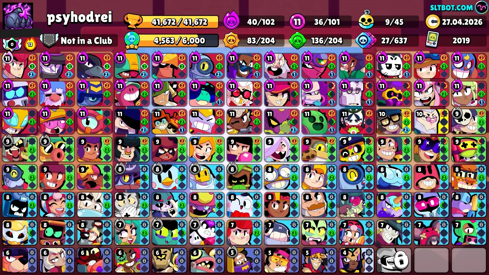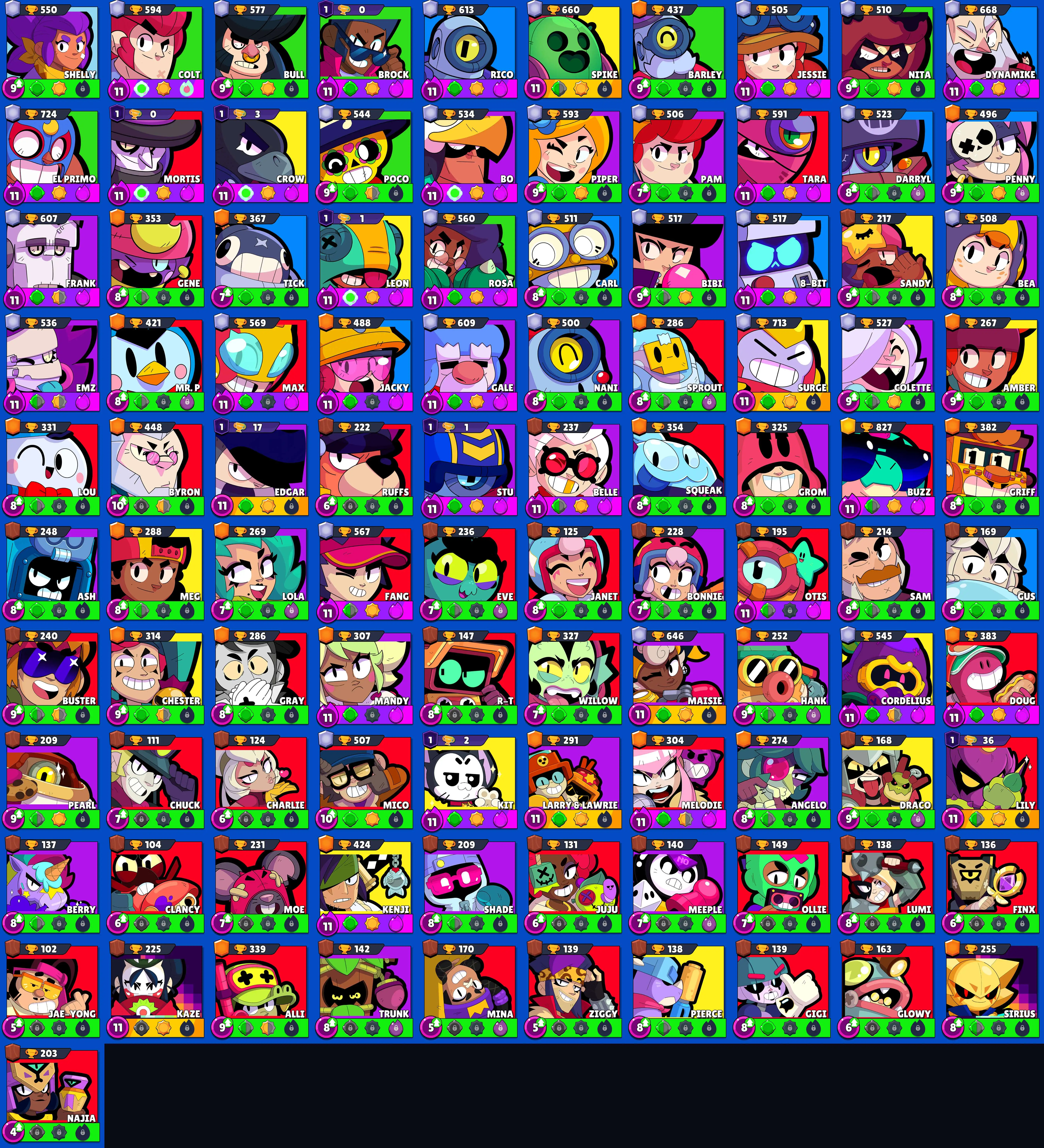 260 SKINS 💯 41.672 TROPHIES 🏆 101 BRAWLERS 🐼 29 HYPERCHARGED 🩸 8 PRESTIGE 💜 36 MAX BRAWLERS 💛 9 BUFFIES 🔑 PINKU PAWLETTE 🧡 PHARAOTIS 🧡 PGM HACKER BROCK 🧡 VALKYRIE JANET 🧡 DARK AMGEL EDGAR 💯 30K 40K