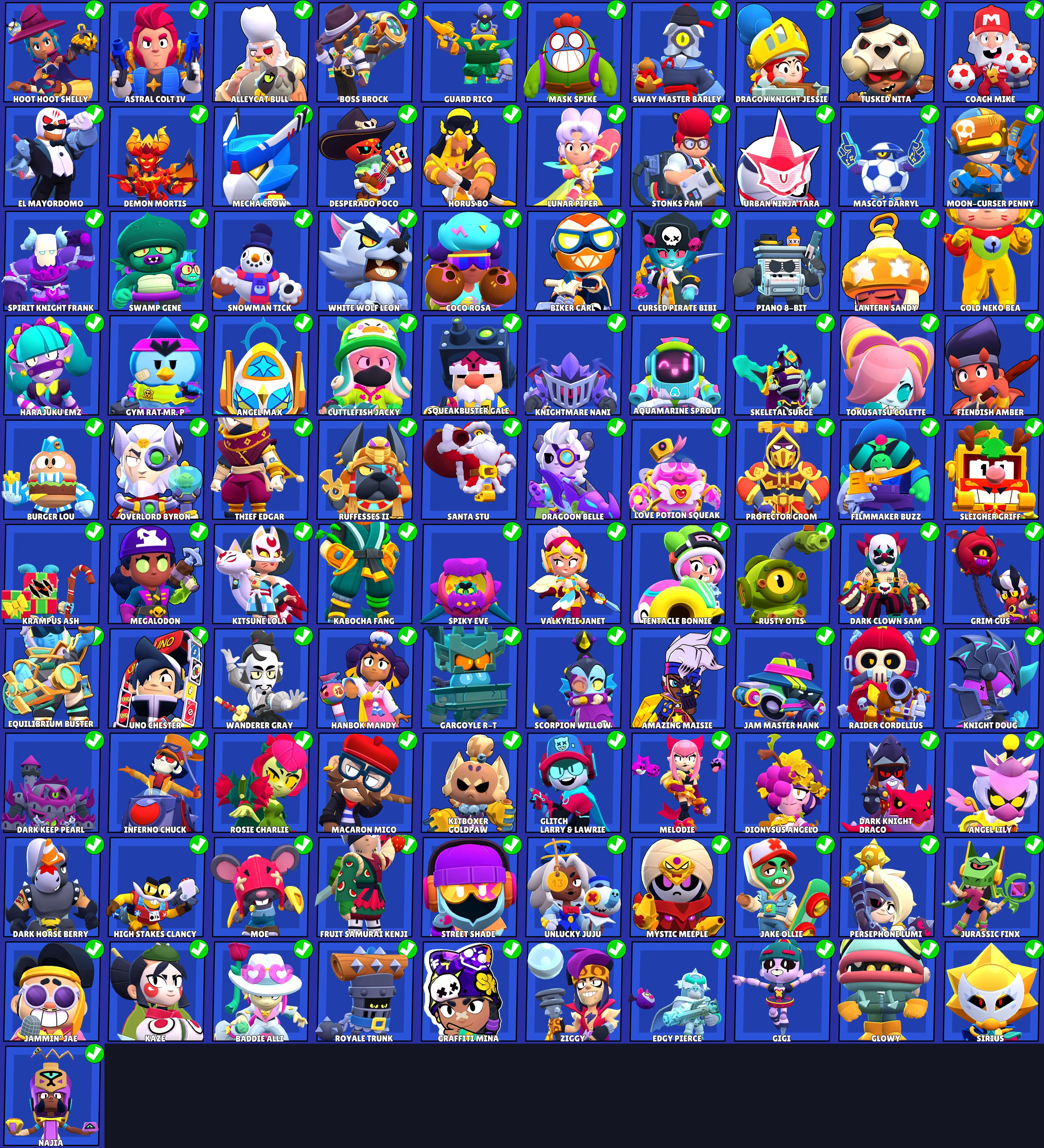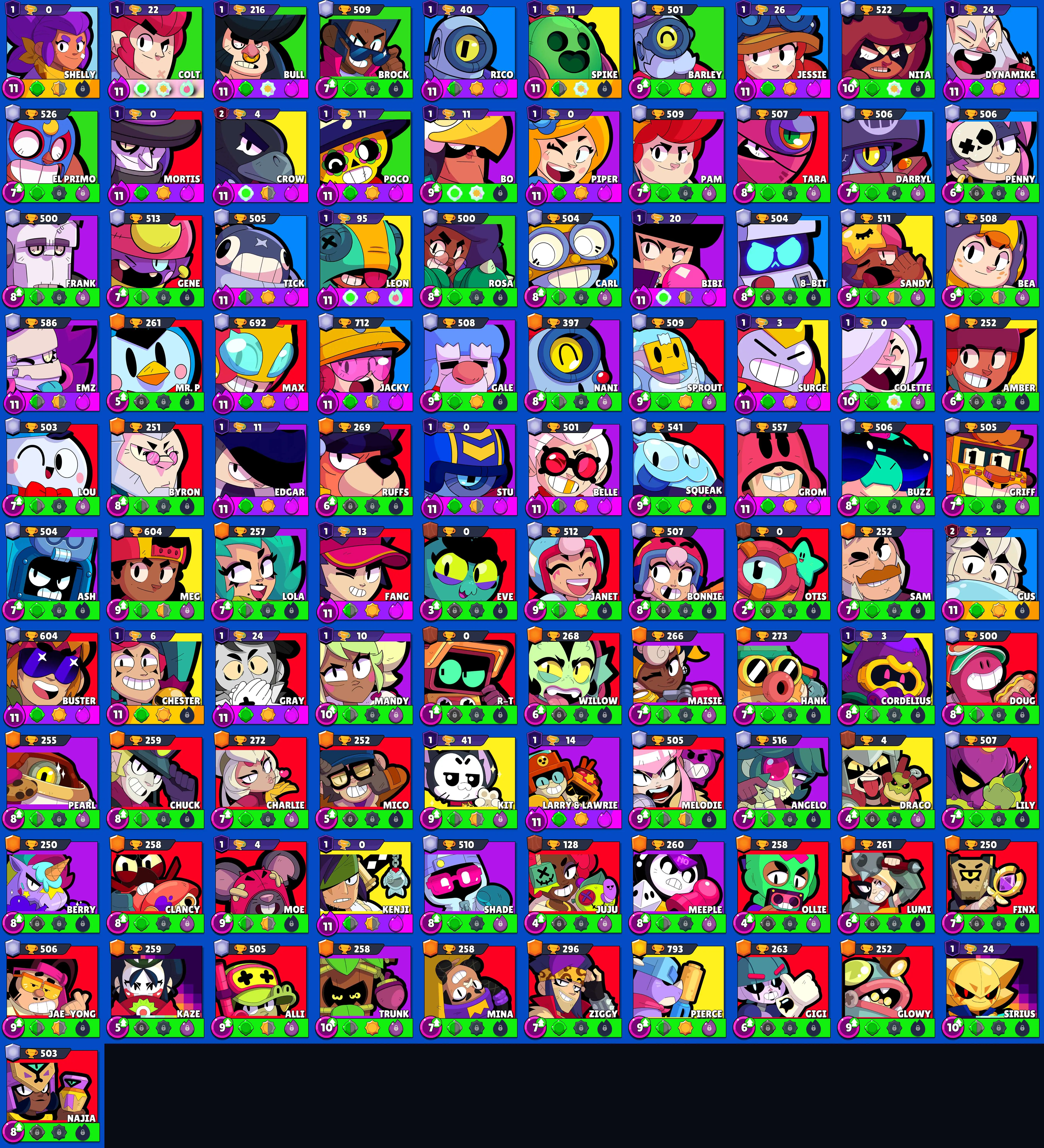 282 SKINS 💯 60.501 TROPHIES 🏆 101 BRAWLERS 🐼 25 HYPERCHARGED 🩸 31 PRESTIGE 💜 29 MAX BRAWLERS 💛 20 BUFFIES 🔑 DEMON MORTIS 🧡 WHITE WOLF LEON 🧡 BANANAS COLT 🧡 RPSIE CHARLIE 🧡 SKELETAL SURGE 💯 50K 60K