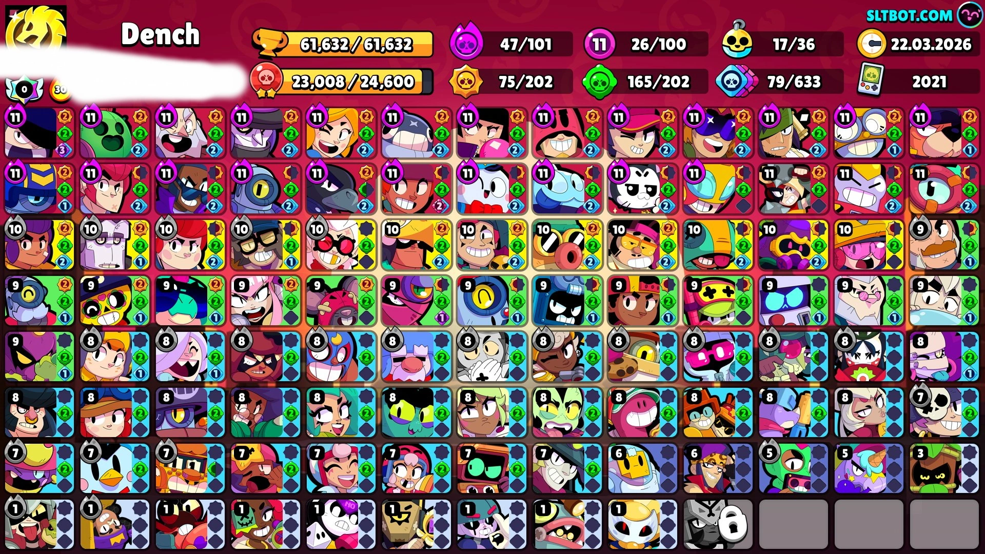 301 SKINS 💯 61.632 TROPHIES 🏆 100 BRAWLERS 🐼 24 HYPERCHARGED 🩸 38 PRESTIGE 💜 26 MAX BRAWLERS 💛 17 BUFFIES 🔑 DEMON MORTIS 🧡 CURSED KENJI 🧡 IMPIE COLETTE 🧡 UNDERWORLD BO 🧡 TRICKY JANET 💯 50K 60K