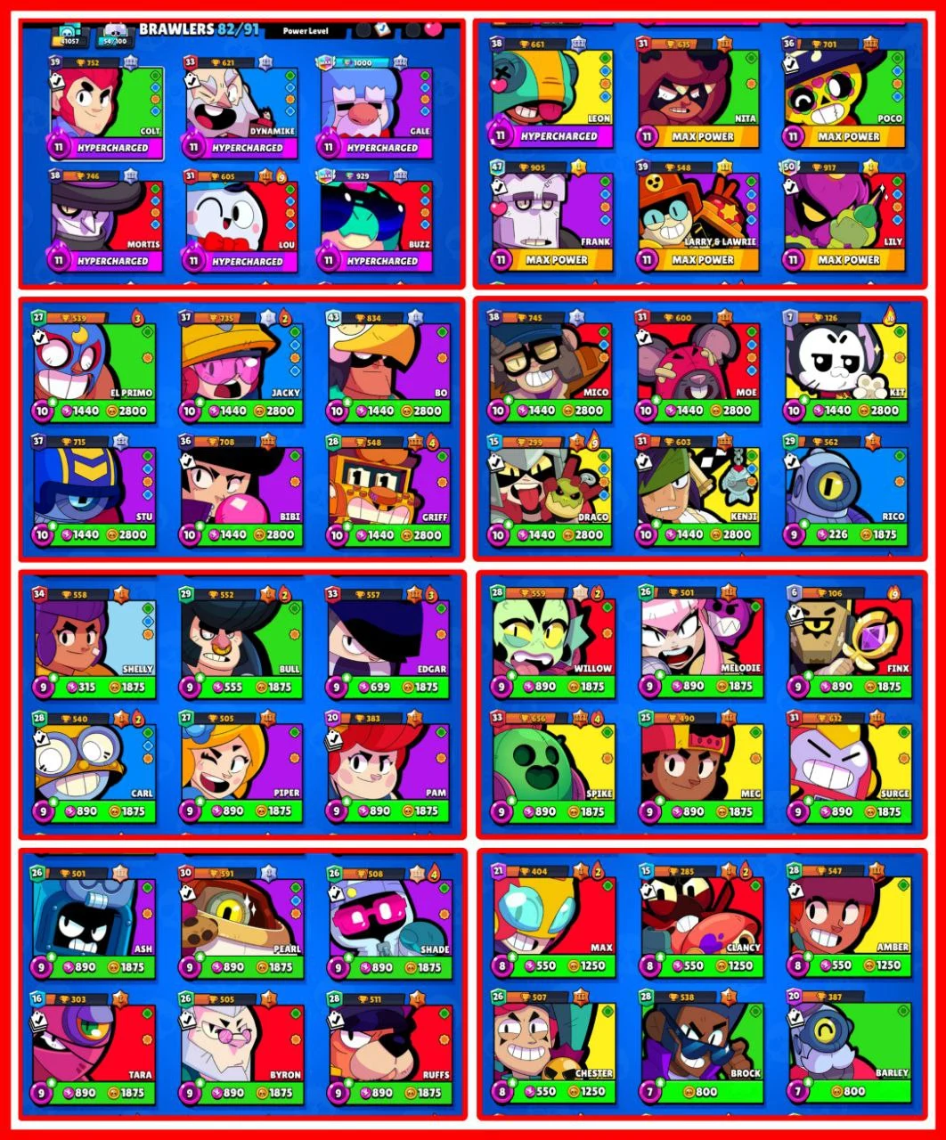 41057 TROPHIES 🏆 170 SKINS 👑 82 BRAWLERS ✨ 13 MAX BRAWLER ✨ 7 HYPERCHARGED BRAWLER ✨ 90 GEMS NAME CHANGE 💎 INSTANT DELIVERY 🚚