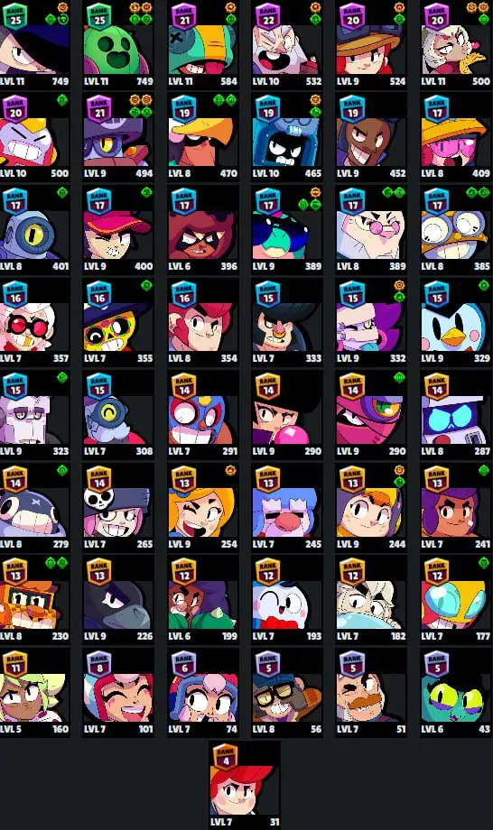 ๐ 49 Brawlers ๐ 15.888 Trophies ๐ 40 Skins ๐ 4 Legends ๐ 11 Mythics ๐ 15 Epics ๐ 6220 Gold ๐ 295 Gems ๐ 3870 Blings ๐