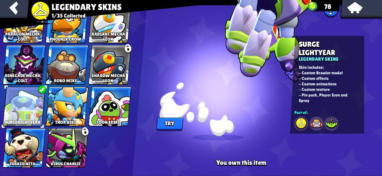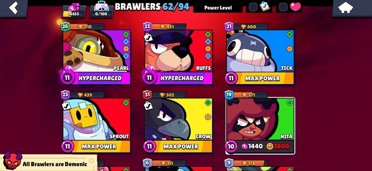 ⭐ 62 BRAWLERS 🎯 5 MAX BRAWLERS 🐼 2 HYPERCHARGED 🎯 14833 TROPHIES 🧥 75 SKINS 🔵 SQUAD BUSTER SHELLY 🔵 SURGE LIGHTYEAR 🔐 FULL ACCESS