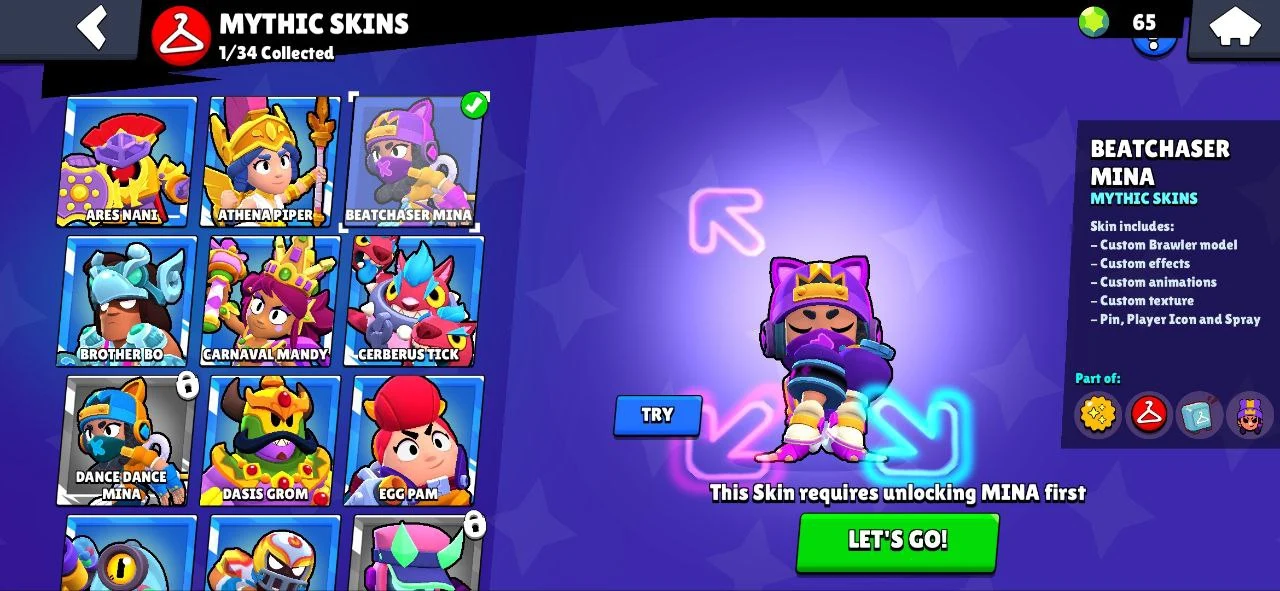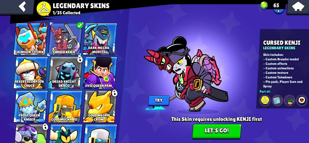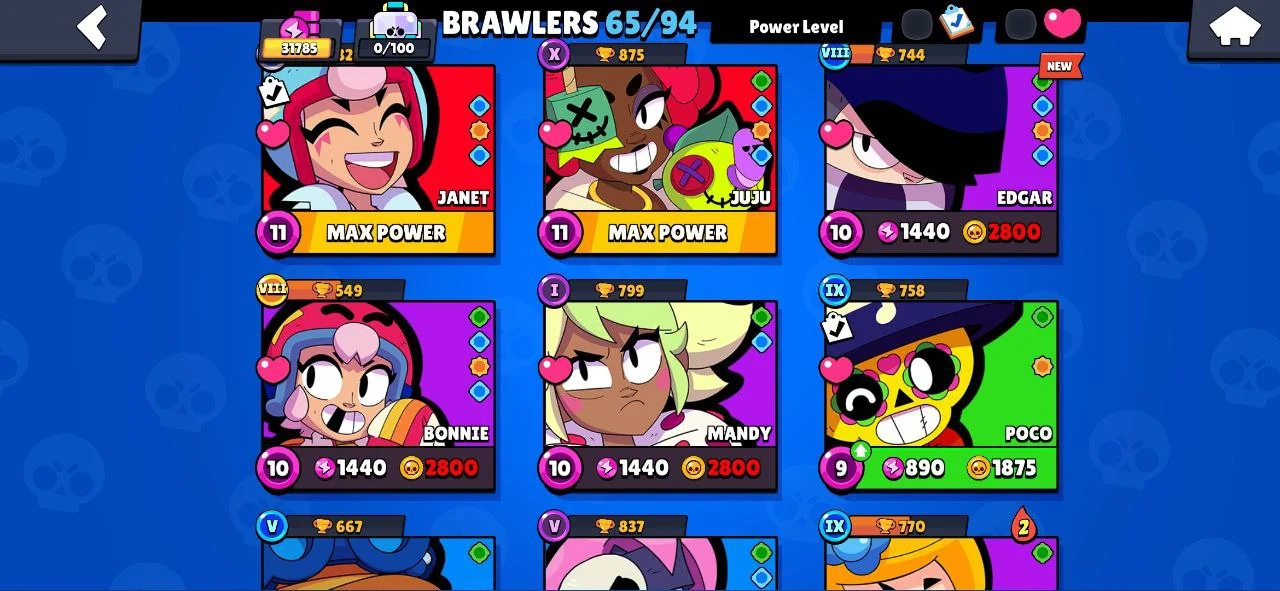 ⭐ 65 BRAWLERS 🎯 8 MAX BRAWLERS 🐼 6 HYPERCHARGED 🎯 31785 TROPHIES 🧥 114 SKINS 🔵 CURSED KENKI 🔵 BEATCHASER MINA 🔵 FRANK BYRON 🔐 FULL ACCESS