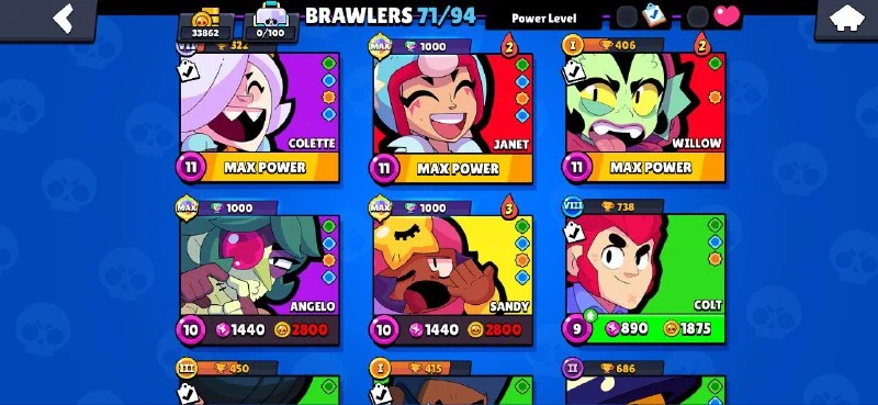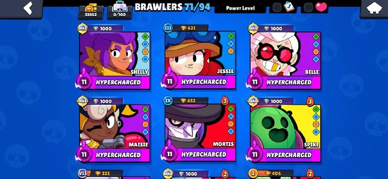 ⭐ 71 BRAWLERS 🎯 9 MAX BRAWLERS 🐼 6 HYPERCHARGED 🎯 33862 TROPHIES 🧥 139 SKINS 🔵 SURGE LIGHTYEAR 🔵 HELLBULL 🔵 SPONGEBOB EL PRIMO 🔐 FULL ACCESS