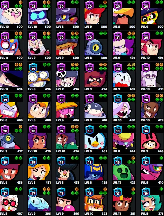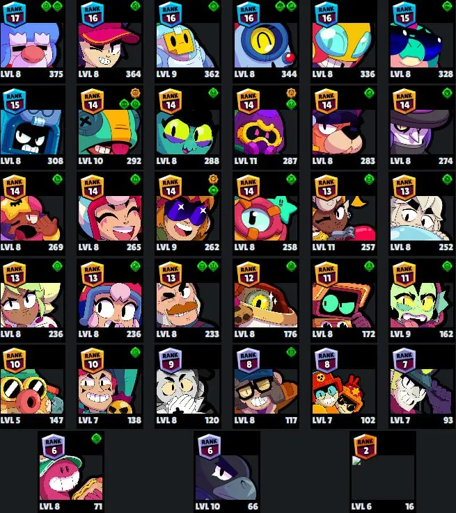 ๐ 75 Brawlers ๐ 27.015 Trophies ๐ 77 Skins ๐ 9 Legends ๐ 22 Mythics ๐ 25 Epics ๐ 2239 Gold ๐ 271 Gems ๐ 2813 Blings ๐