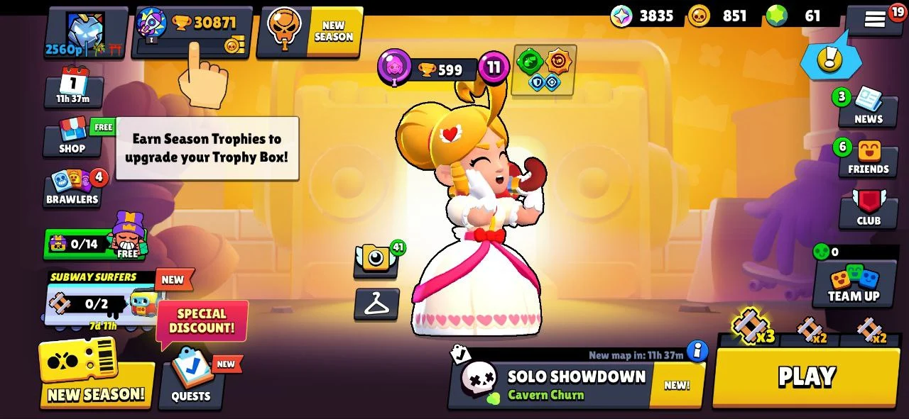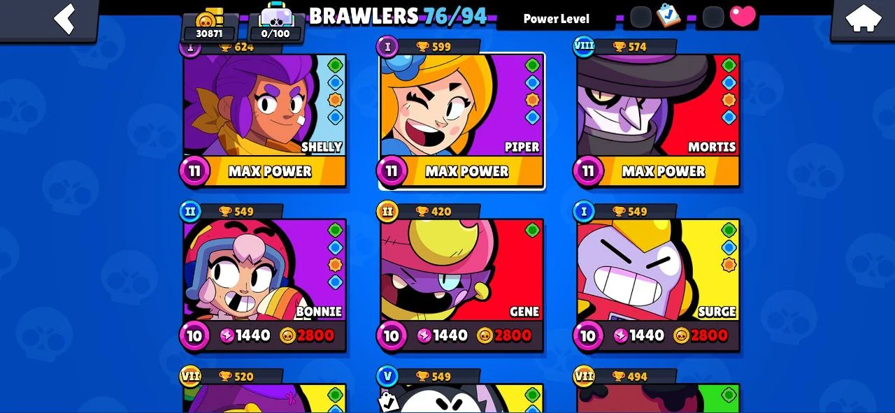 ⭐ 76 BRAWLERS 🎯 9 MAX BRAWLERS 🐼 6 HYPERCHARGED 🎯 30871 TROPHIES 🧥 75 SKINS 🔵 COACH MIKE 🔵 DOCTOR EDGAR 🔵 KITBOXER 🔐 FULL ACCESS