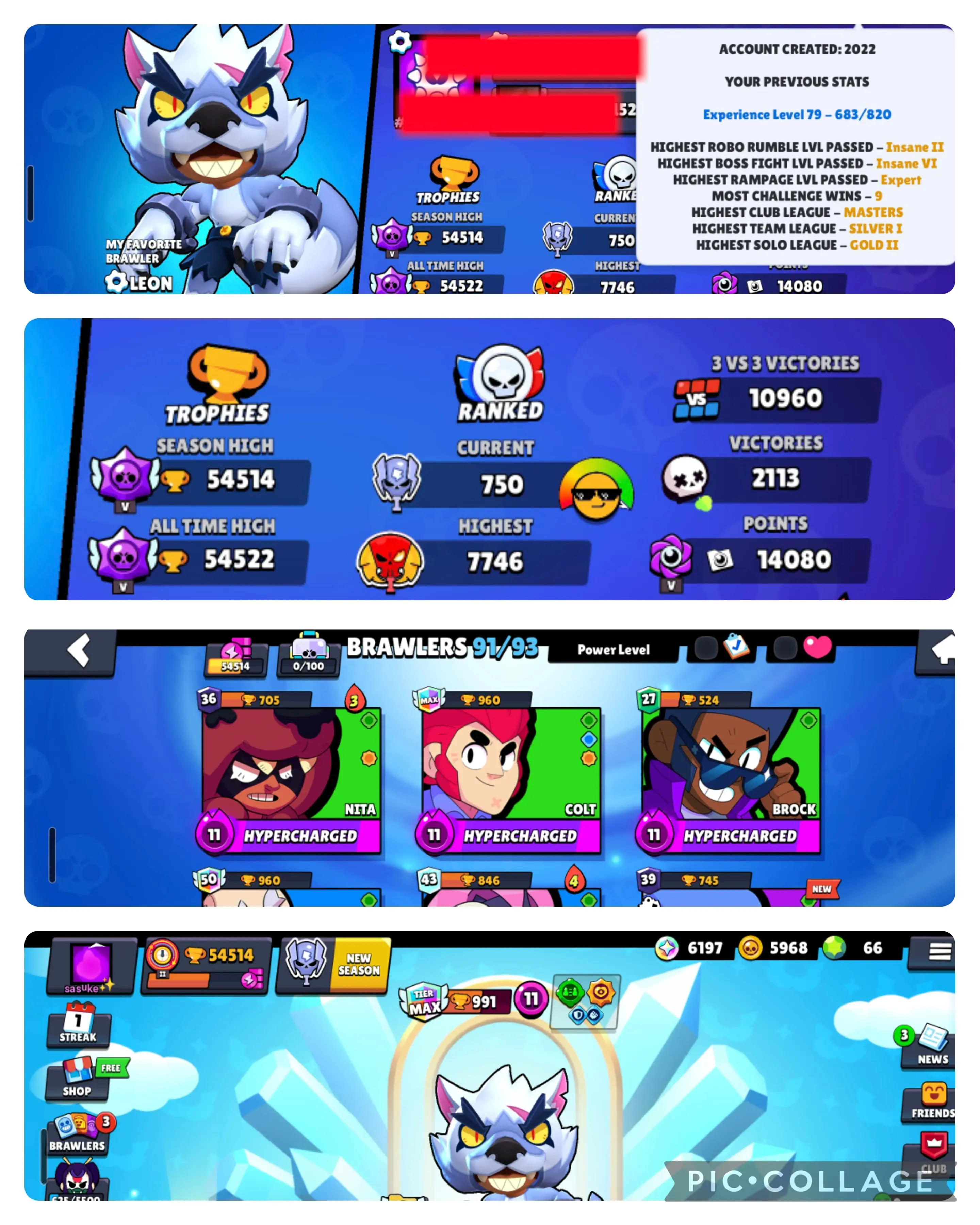 ✨️RAREST ⸱ 54K TROPHY ACCOUNT 💛 91 BRAWLERS 🥶3 LEGENDARY SKINS ,47 EPIC 🍭OP LEGENDARY EMOTES 😈PROFILE FRAME 🔥MASTERS BEST RANK 🙂↕️15 HYPERCHARGED ,20 PLUS MAX BRAWLERS 🤽 KB 1
