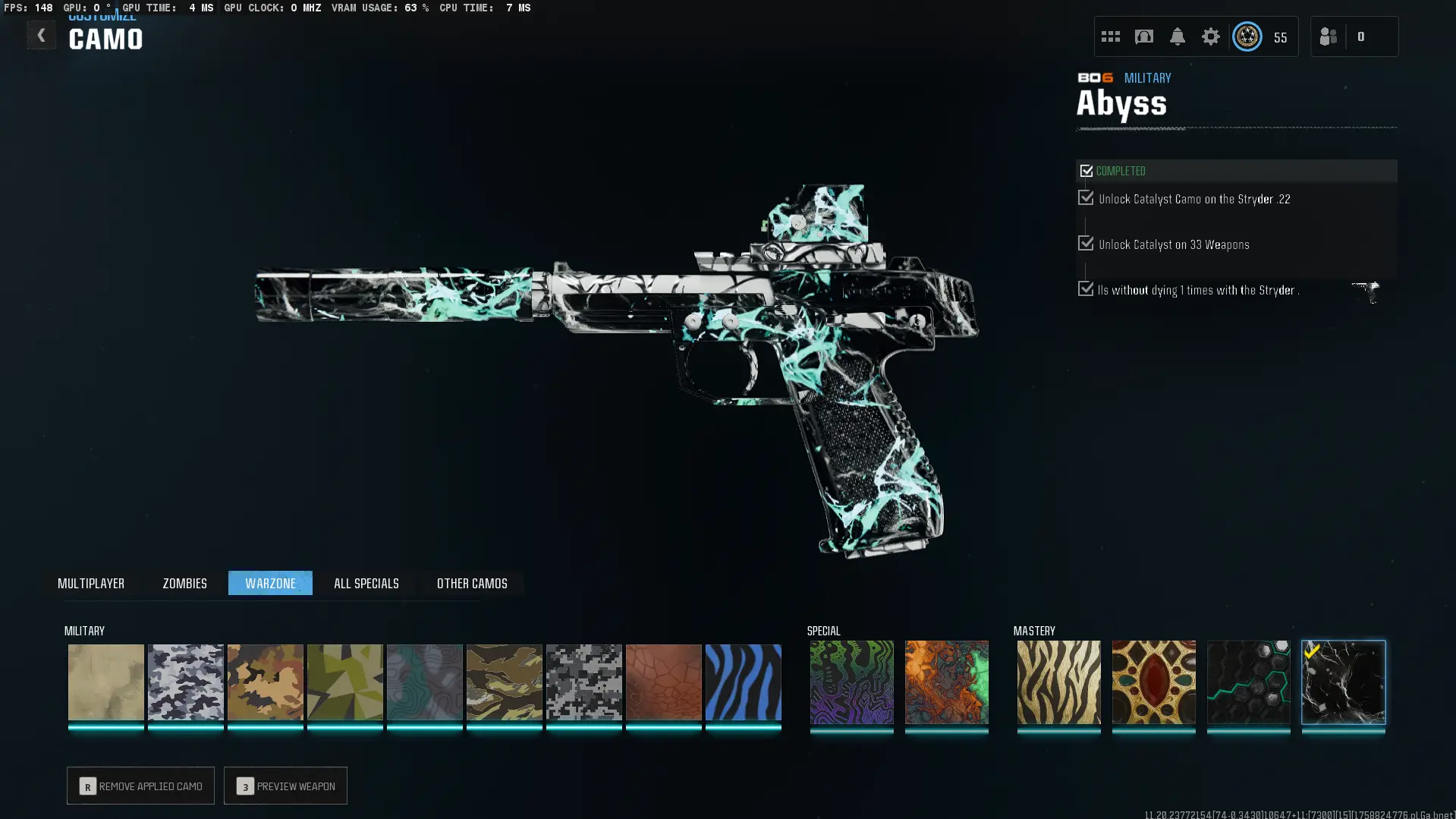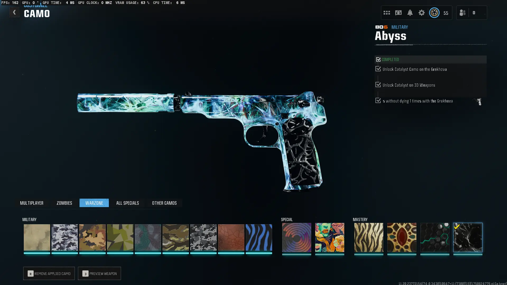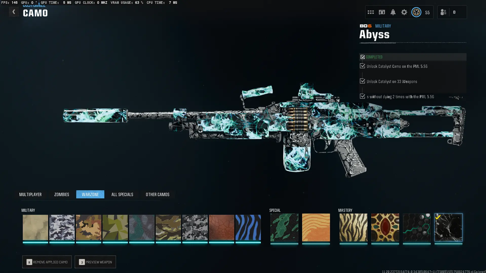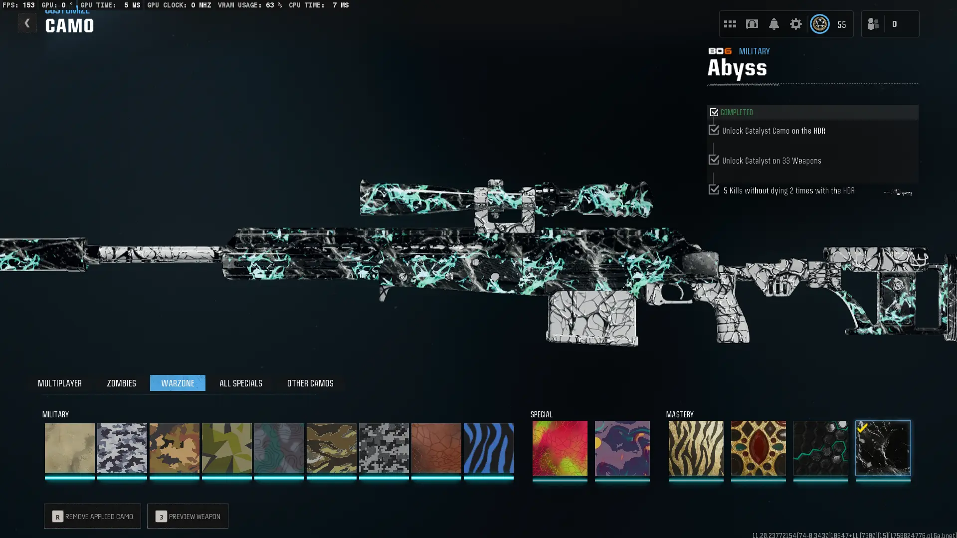 【Abyss Camo Unlocked】✨ LVL 55 | 33x Abyss with 3 Sniper included 💠 33x Gold Tiger ✨ 33x Catalyst ⚗️33x King’s Ransom ✨ ✨ Warzone Camos ✅ ⚡ Instant Delivery✨