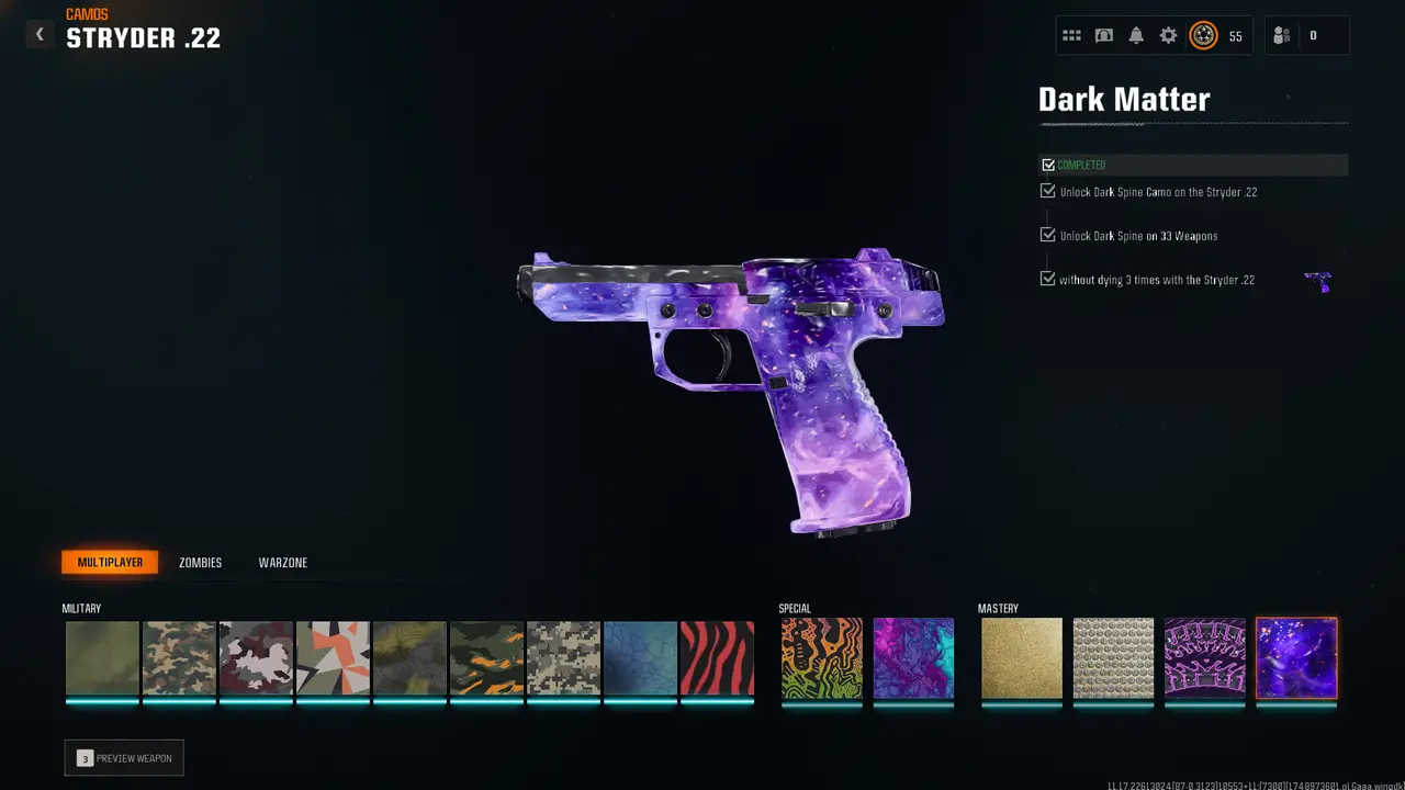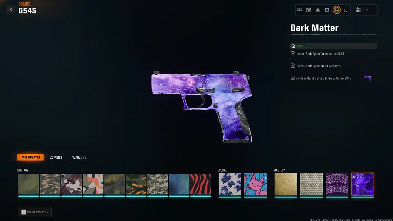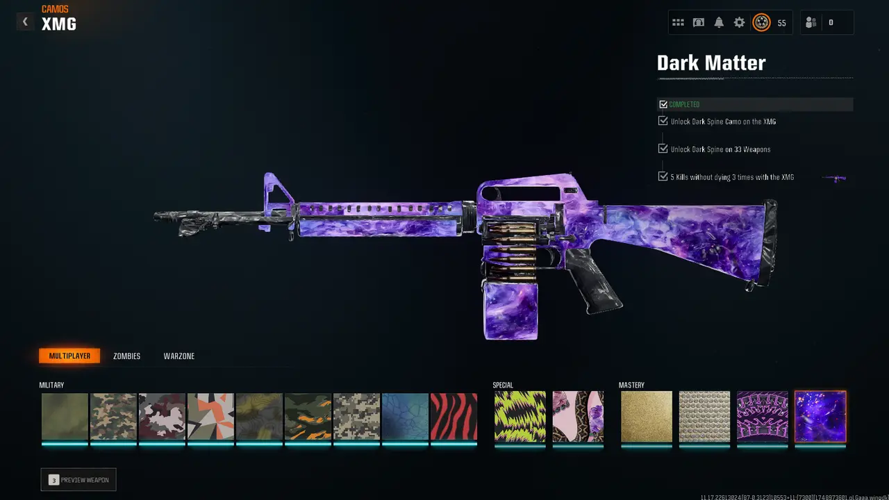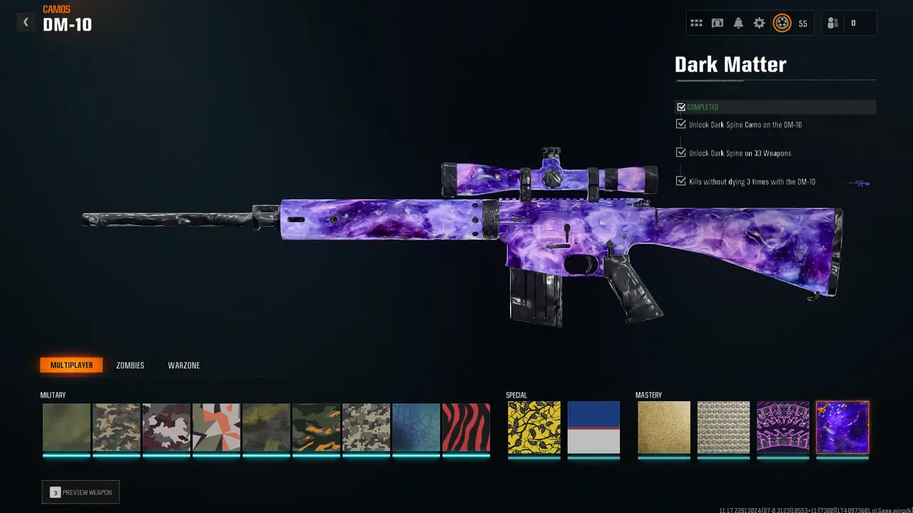 Dark Matter legit 33 BO6 🦃 Prestige 1 [55] 🥩 Diamond 🎐 Dark Spine 🐘 Gold 🪥 Works on Steam/PSN/Bnet/Xbox 🧿 Instant Delivery 🧵 SaintStore Guarantee