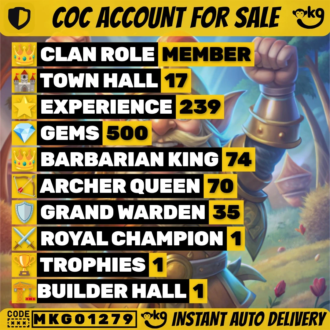 🔥 COC TH17 Max Defenses | 🧙 Max Warden | ⚔️ 5 Epic Equipments (AF, MM, FB, RS, EB) | 🦸 Heroes 74-92-70-75-35 | ⚡ 239 XP Level | 🏆 310 CWL Medals | 💎 500 Gems | 🎒 Cool Magic Items | 👑 3 Hero Skins | 🚚 Super Fast Instant Delivery !MKG01279