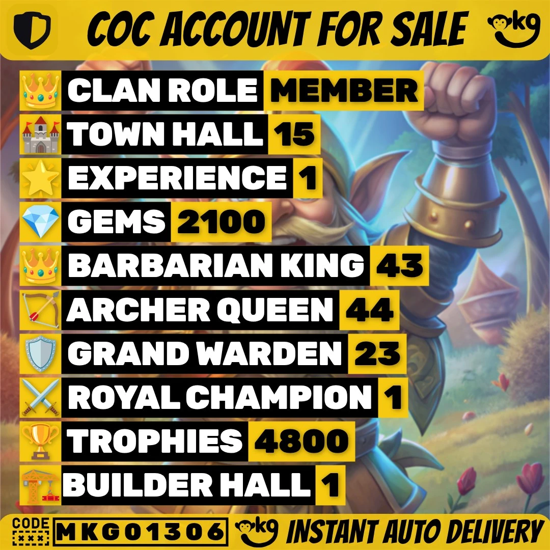 🔥 TH15 Semi | 💎 2.1K Gems | ⚔️ 8 Epic Equipments Loaded (SB, GG, AF, MM, DC, LP, FB, EB) 🥵 | 🦸 Heroes 43-54-44-27-23 🥶 | 💪 4.8K+ Raid Medals | ✨ Free Rename 🥶 | 👑 Dragon Warden Skin | 🏗️ OP Builder Hall 😱 | 🚚 Instant Delivery ✅ Truste... !MKG01306