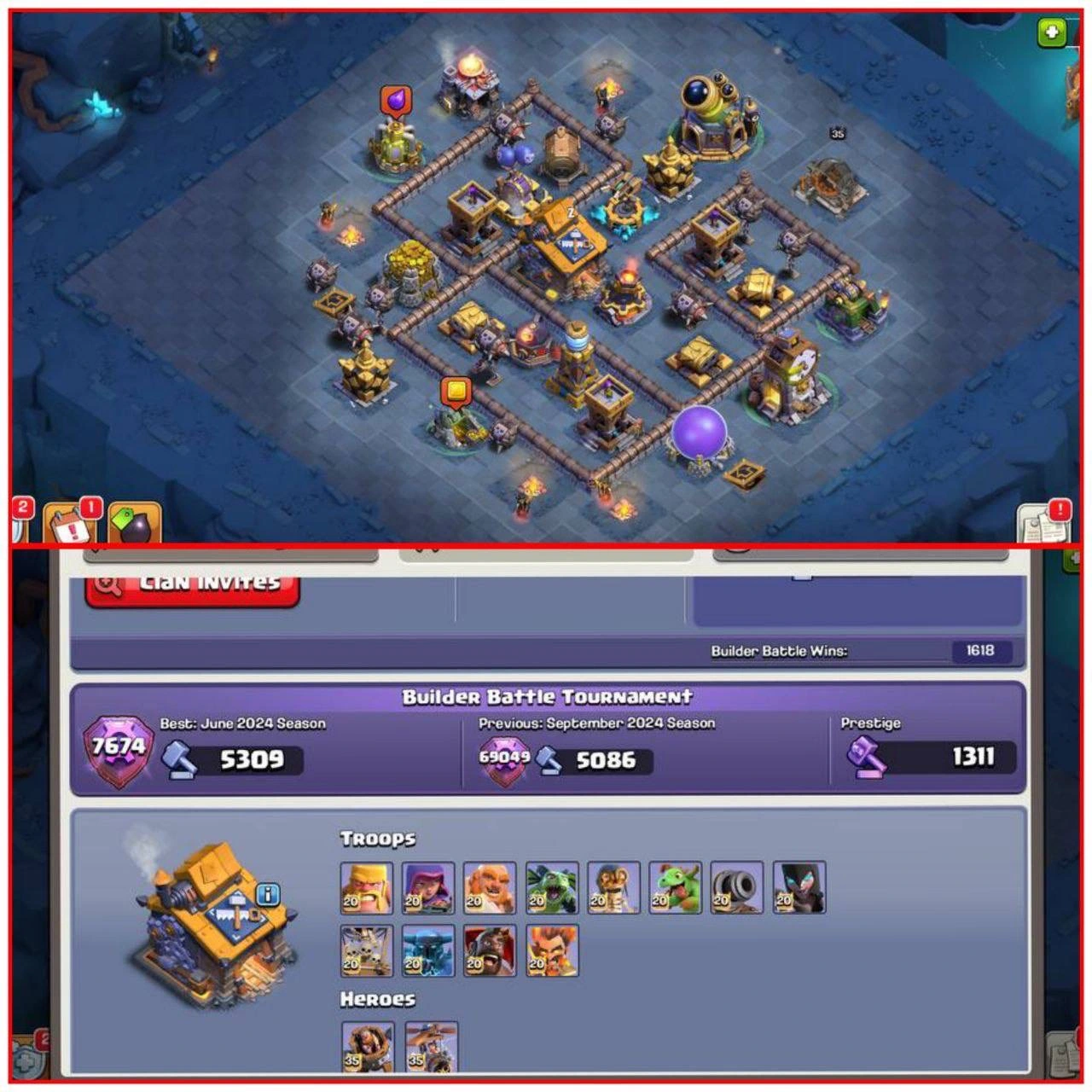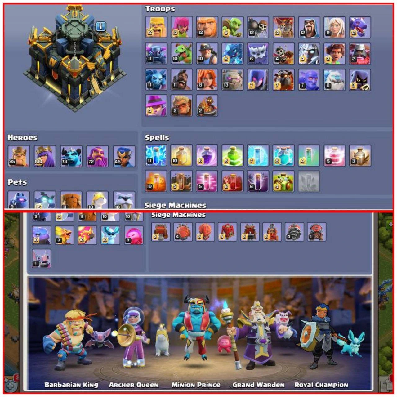 NEAR MAX TH17 ⭐️ 38 HEROES SKINS 🌊 ALMOST MAXED HEROES [95-100-73-72-45] 💥 10 EPIC EQUIPMENTS 💫 VERY GOOD DEFENCE & LAB ⚡️ {255 EXP} ☠️ BUILDER HALL 10 MAXED OUT 🔥 NAME CHANGE 1k GEMS