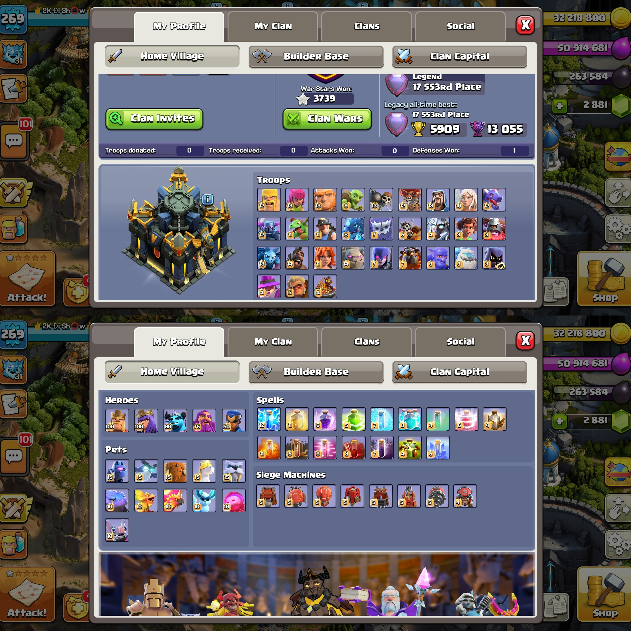 Rare [ League Skins Set ] ⚡ 32/32 Equipments Max ⚡ TH 17 1000% Premium max⚡Nothing Left ⚡Rare 18 Scenery ⚡65 Skins ⚡Rare Decorations ⚡Clash Of Dragon scenery ⚡Bh 10 Max ⚡269 Xp ⚡ 100% Safe Guarantee ⚡ Instant Delivery