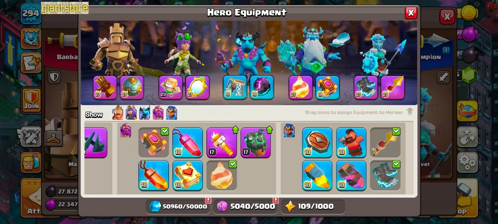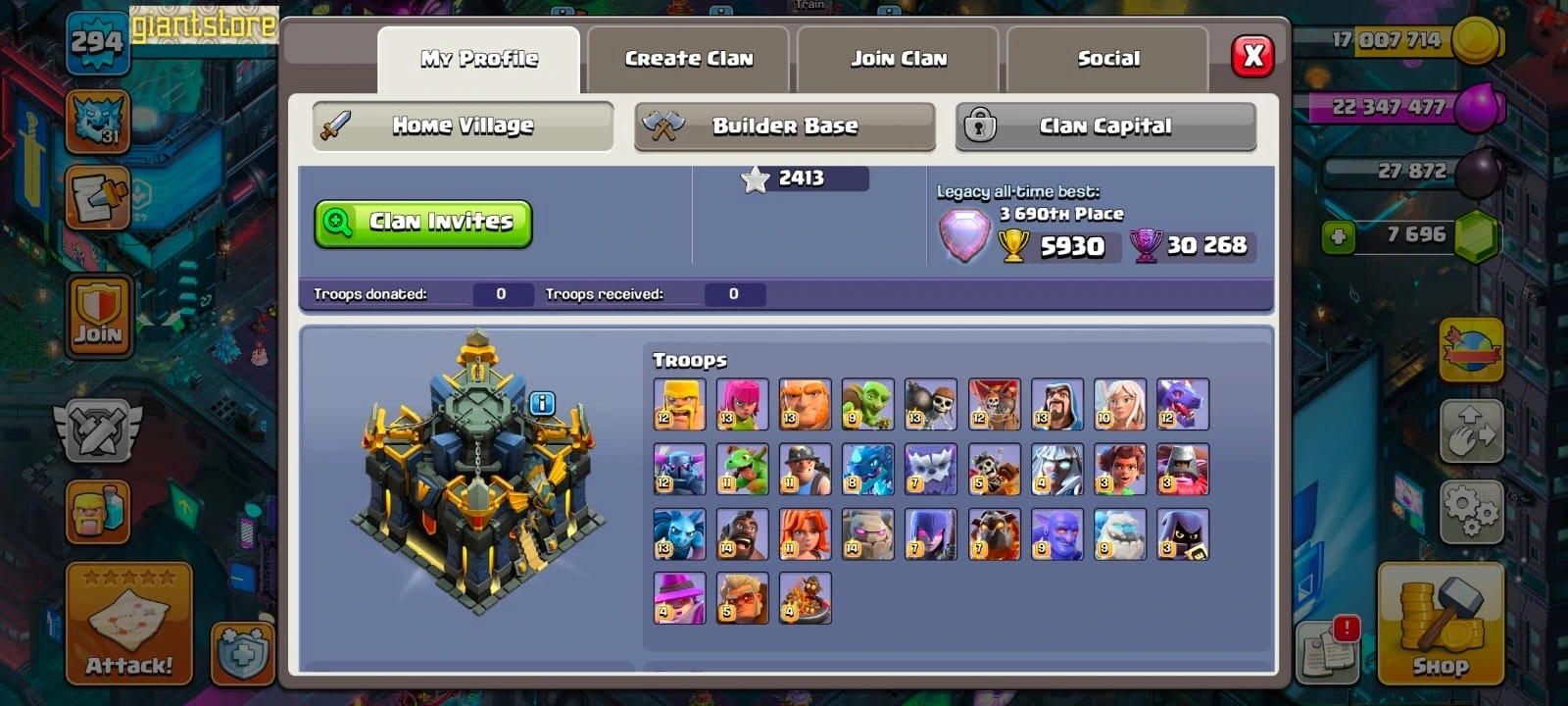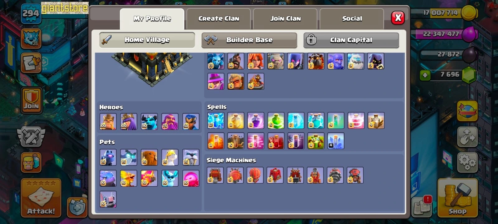 RARE✅HIGH XP 294☠️6 max epic equipment🔥TH 17 ALL MAX🔥max heroes🔥max pets🔥max troops⚒️max builder base⚡️all supercharge defense💎7700 gems⭐️492 cwl medal