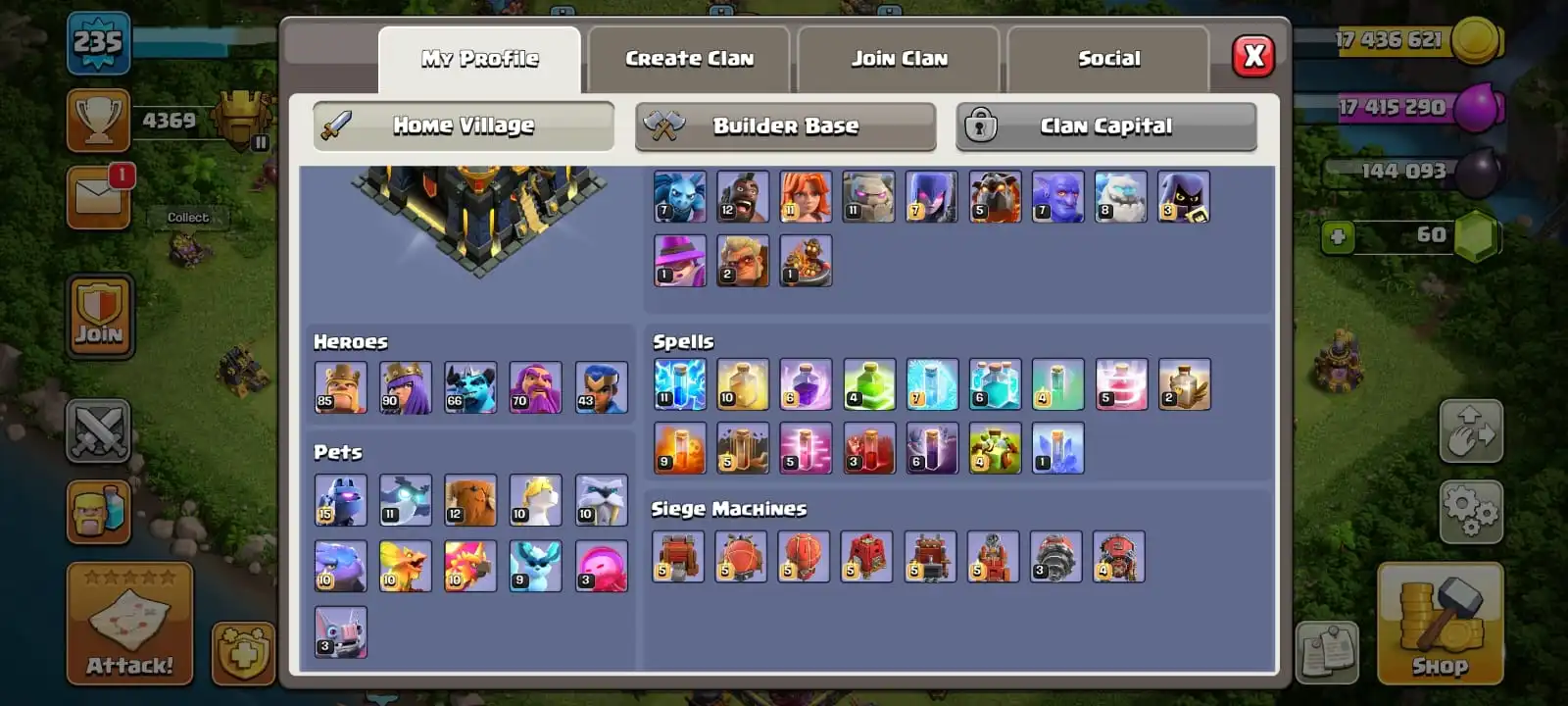 TH 17 ALL MOST MAX🔥HEROES 85-90-66-70-43 GIANT GAUNTLET & SPIKY BALL & MAGIC MIRROR & ROCKET SPEAR ON🔥MAGIC & JUNGLE & CLASH A RAMA SCENERY🔥MAGIC ITEMS READY🔥FULL ACCESS ACCOUNT🔥