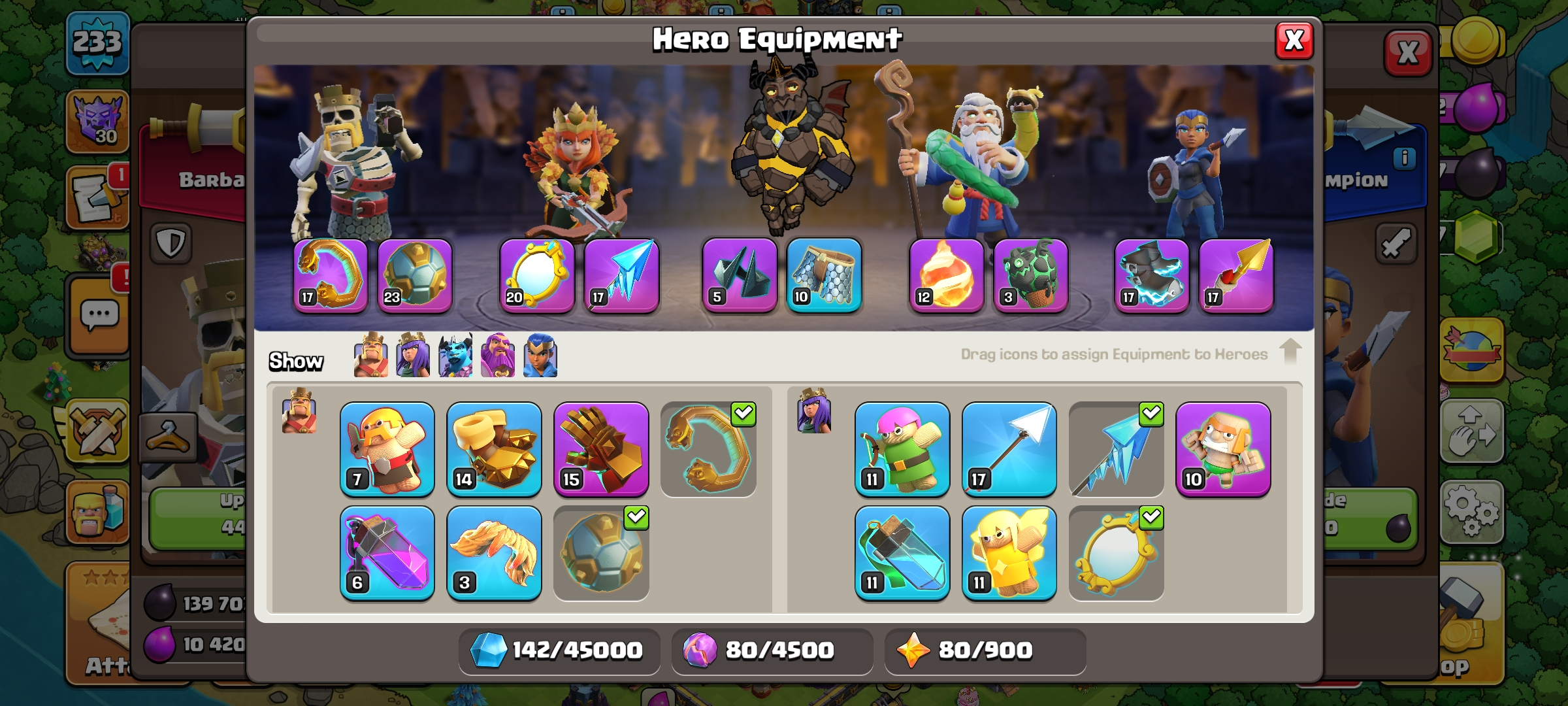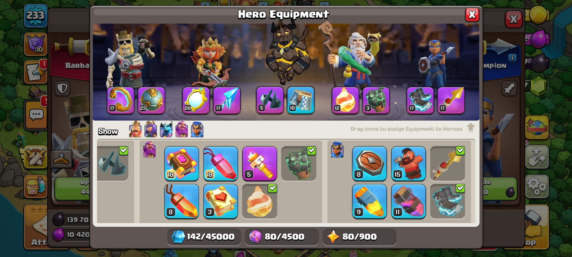 TH 17 ALMOST MAX~HERO EQUIPMENT FULL SET (EPIC)- XP 233/BK 53 -/AQ 95/PM 42 /GW 48-/RJ 33-/LOG SUPERCELL ID-/Andoid and ios|SCREENSHOTS ON DESCRIPTION