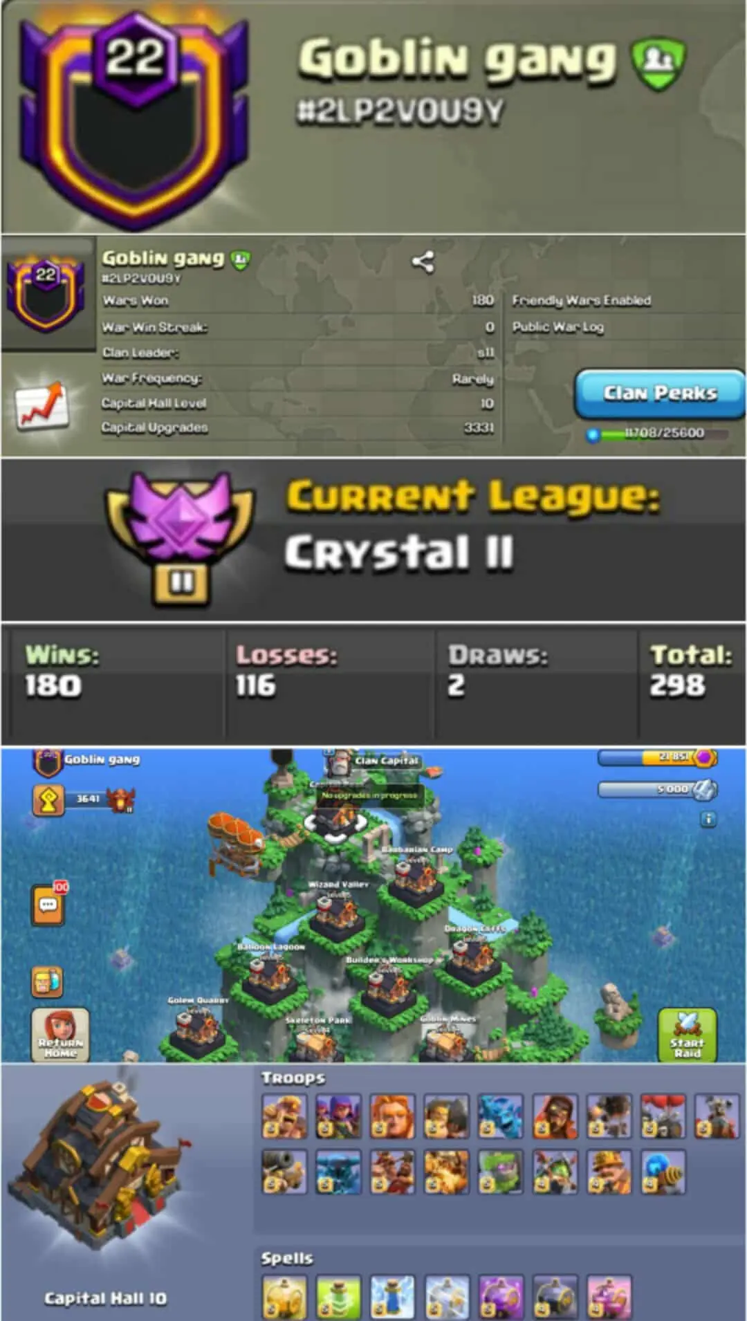 GOBLIN GANG | LEVEL 22 RARE CLAN NAME | CAPITAL MAX | CRYSTAL 3 CWL LEAGUE | WIN 180 | LOSE 116