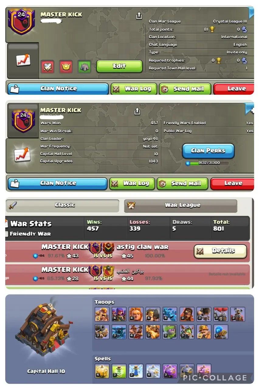 🔥[CC 10]🔥NAME- MASTER KICK | 💥LVL- 24.5 |☠️ WARLOG W-L-D: 457-339-5☠️ | CWL LEAGUE : CRYSTAL 3 🏆 |⚡⚡