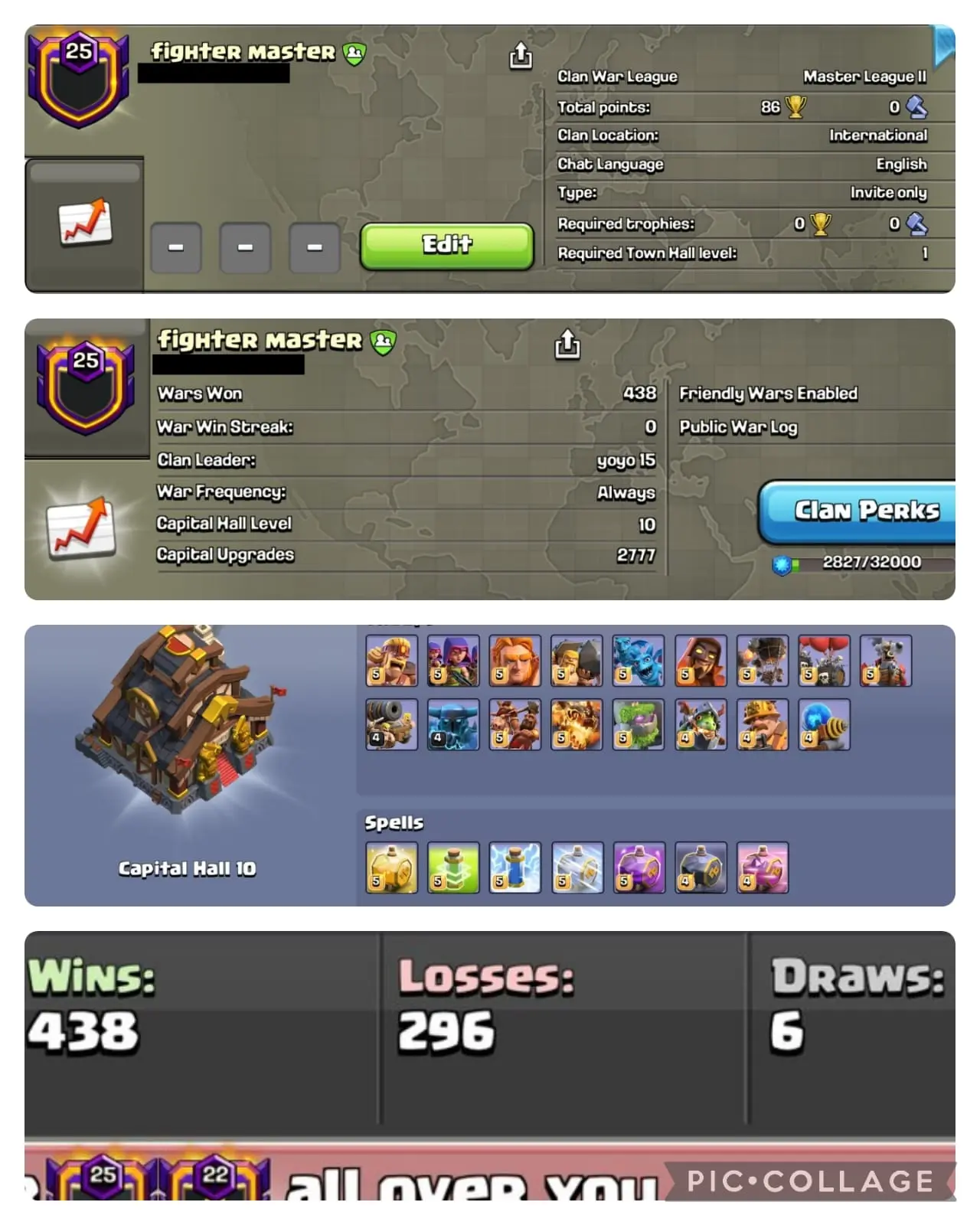 🔥NAME- fighter master | LVL 25🥵| 💥WARLOG W/L/D:438/296/6 | CWL League: MASTER 2🏆| CC: ALMOST MAX 10 !!💥