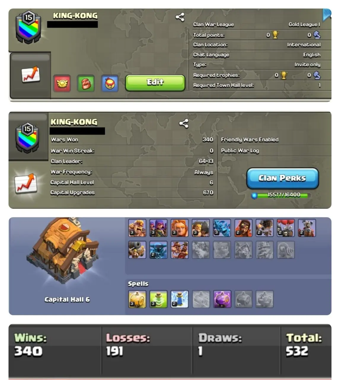 🔥NAME- KING KONG | ALMOST LVL 16🥵| 💥WARLOG W/L/D:340/191/1 | CWL League: GOLD 1🏆| CC: 6 !!💥