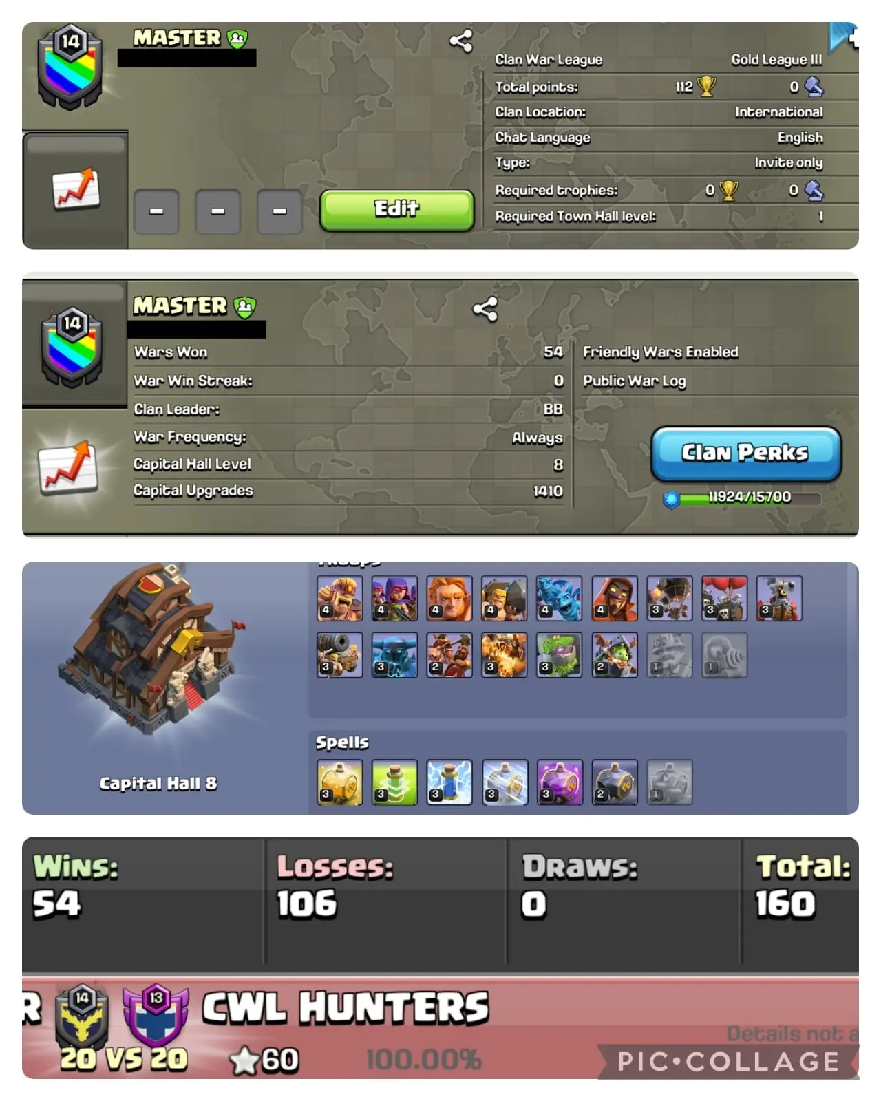 🔥NAME- MASTER | LVL 14.7🥵| 💥WARLOG W/L/D:54/106/0 | CWL League: GOLD 3🏆| CC: ALMOST 9 !!💥