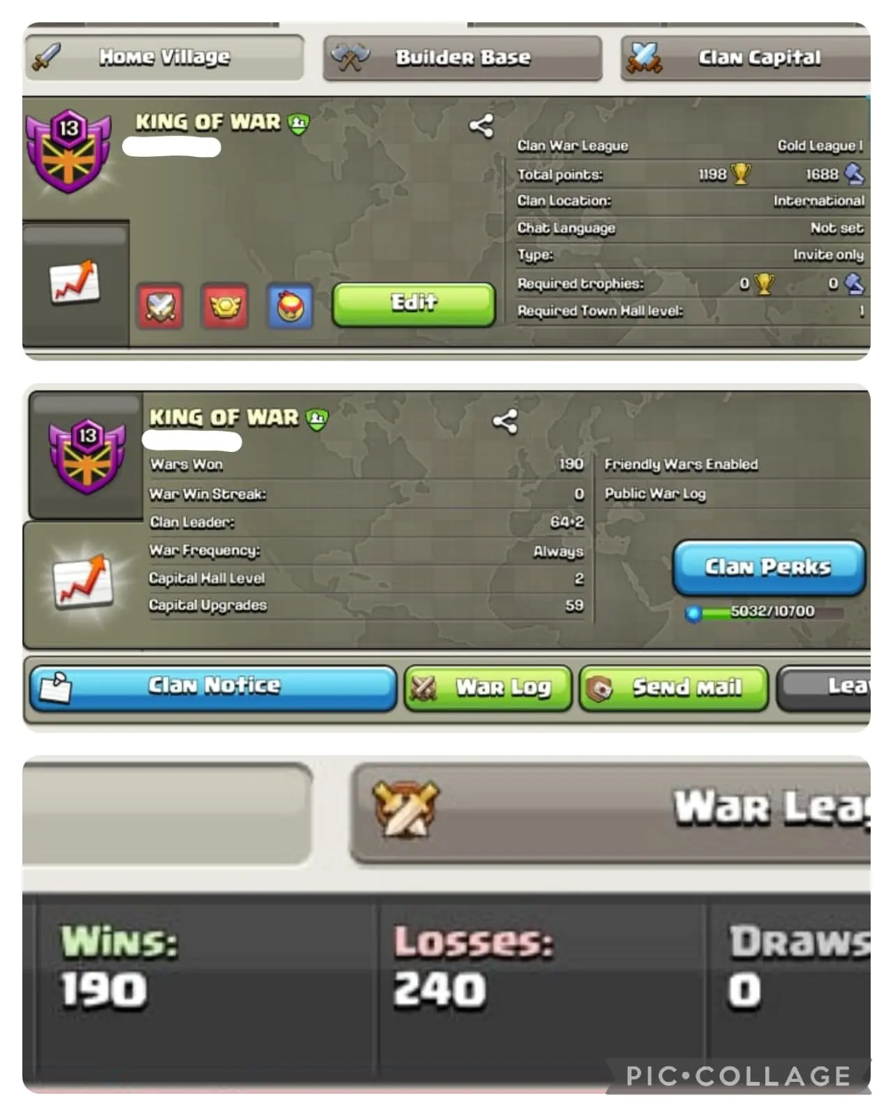 🔥NAME- KING OF WAR | 💥LVL- 13 |☠️ WARLOG W-L-D: 190-240-0 | CWL LEAGUE : GOLD 1🏆 | ⚡⚡