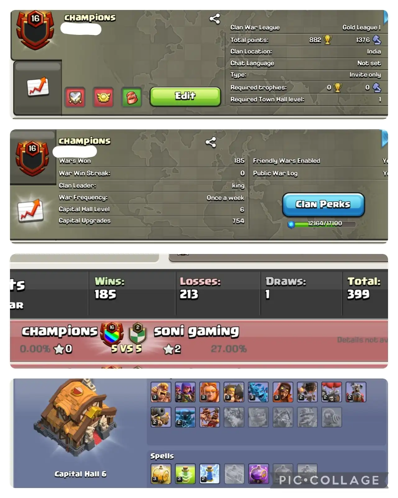 🔥NAME- champions | 💥LVL- 16.8 |☠️ WARLOG W-L-D: 185-213-1 | CWL LEAGUE : GOLD 1 🏆 | CC: ALMOST 7 !!⚡⚡